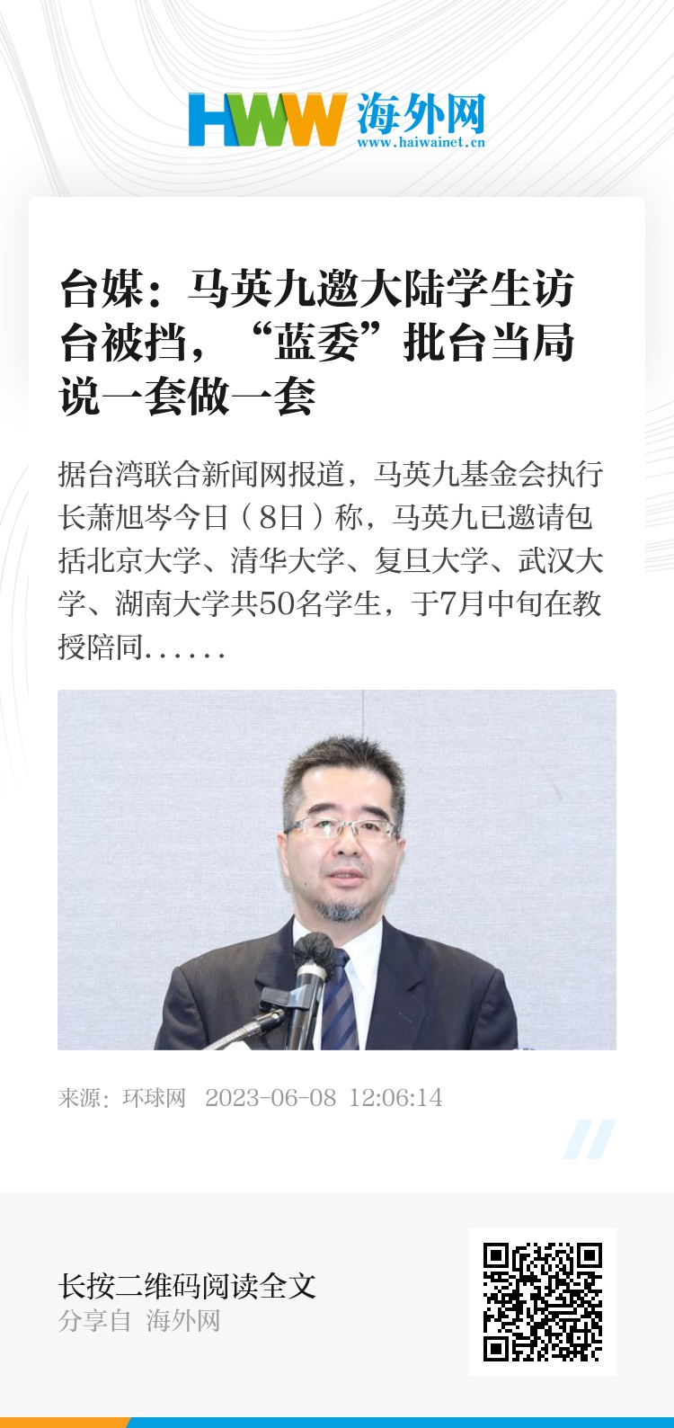 据台湾联合新闻网报道,马英九基金会执行长萧旭岑今日(8日)称,马英九已邀请包括北京大学、清华大学、复旦大学、武汉大学、湖南大学共50名学生,于7月中旬在教授陪同下访台,但和台陆委会私下沟通时对方却称没重要性、迫切性也没不可替代性,态度保留,甚至要基金会不要送件,说“不会过”。对此,国民党立法机构党团总召曾铭宗表示,民进党当局永远是说一套做一套。