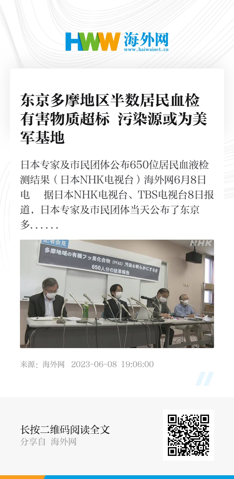海外网6月8日电 据日本NHK电视台、TBS电视台8日报道,日本专家及市民团体当天公布了东京多摩地区650名居民的血液检查结果,超过半数居民血液中的有机氟化合物(PFAS)含量超过美国规定的基准值,可能对人体健康产生威胁。