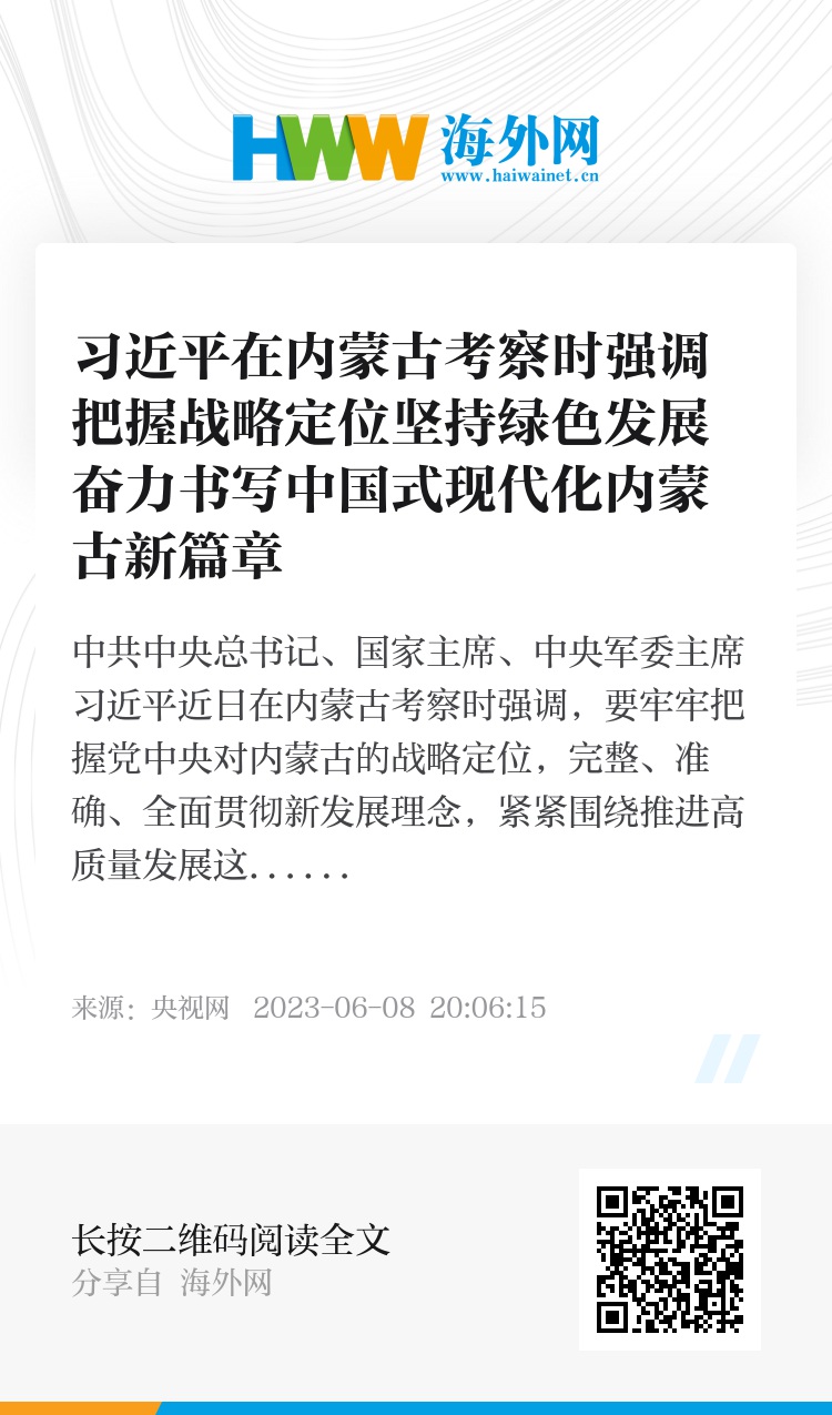 中共中央总书记、国家主席、中央军委主席习近平近日在内蒙古考察时强调,要牢牢把握党中央对内蒙古的战略定位,完整、准确、全面贯彻新发展理念,紧紧围绕推进高质量发展这个首要任务,以铸牢中华民族共同体意识为主线,坚持发展和安全并重,坚持以生态优先、绿色发展为导向,积极融入和服务构建新发展格局,在建设“两个屏障”、“两个基地”、“一个桥头堡”上展现新作为,奋力书写中国式现代化内蒙古新篇章。