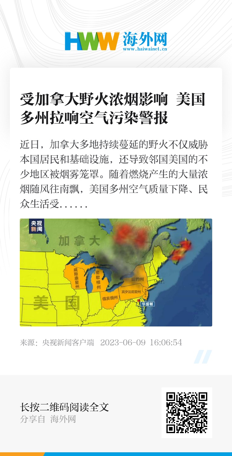 随着加拿大过火面积不断扩大,美国的污染持续加剧。美国环境和气象部门当地时间7日对东海岸和中西部多地发出空气质量警报,多座主要机场航班延误,学校活动、体育比赛等多方面均受影响。纽约州长称,该州部分地区的空气污染指数达到正常水平的8倍,已经构成“紧急危机”。