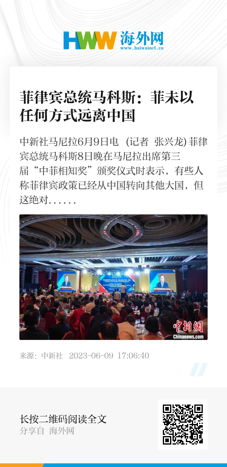 中新社马尼拉6月9日电 (记者 张兴龙)菲律宾总统马科斯8日晚在马尼拉出席第三届“中菲相知奖”颁奖仪式时表示,有些人称菲律宾政策已经从中国转向其他大国,但这绝对不是事实。菲律宾未以任何方式远离中国。