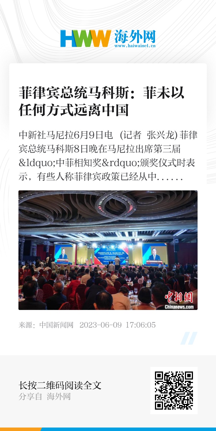 中新社马尼拉6月9日电 (记者 张兴龙)菲律宾总统马科斯8日晚在马尼拉出席第三届“中菲相知奖”颁奖仪式时表示,有些人称菲律宾政策已经从中国转向其他大国,但这绝对不是事实。菲律宾未以任何方式远离中国。