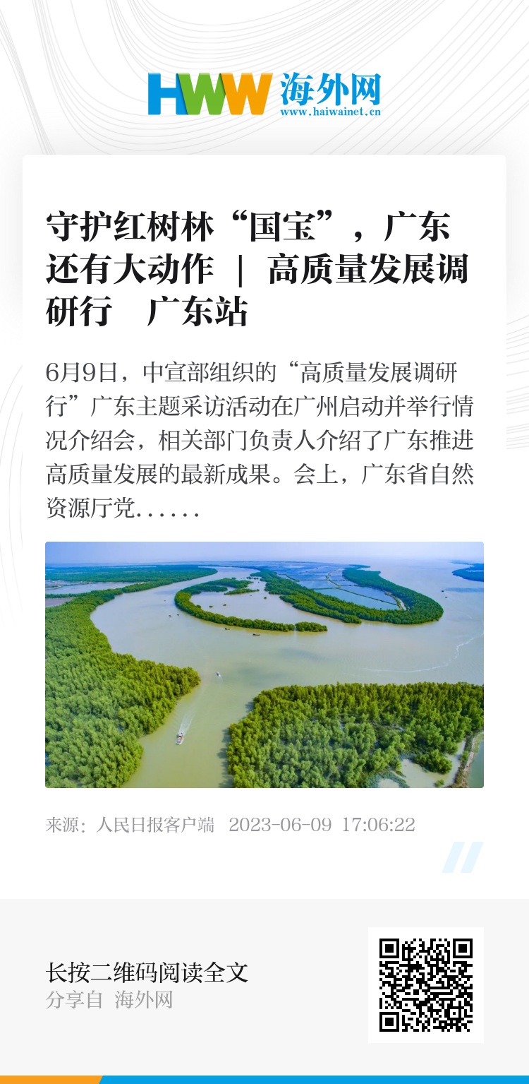 不久前,广东省自然资源厅、广东省林业局共同印发了《广东省红树林保护修复专项规划》,对全省红树林保护修复工作进行了系统的部署,为科学提高红树林生态系统质量、全面提升沿海生态安全保障能力、有序增强蓝碳生态系统建设提供了解决方案。随着“绿美广东”生态建设全面铺开,广东将进一步建立健全保护修复机制,科学、整体、系统开展保护修复,强化红树林生态系统监测评估、加强红树林科普宣教、促进红树林生态资源价值实现,致力将红树林打造成为广东生态文明建设的又一靓丽名片。(人民日报客户端广东频道刘涓溪 闫伊乔 孟繁哲)