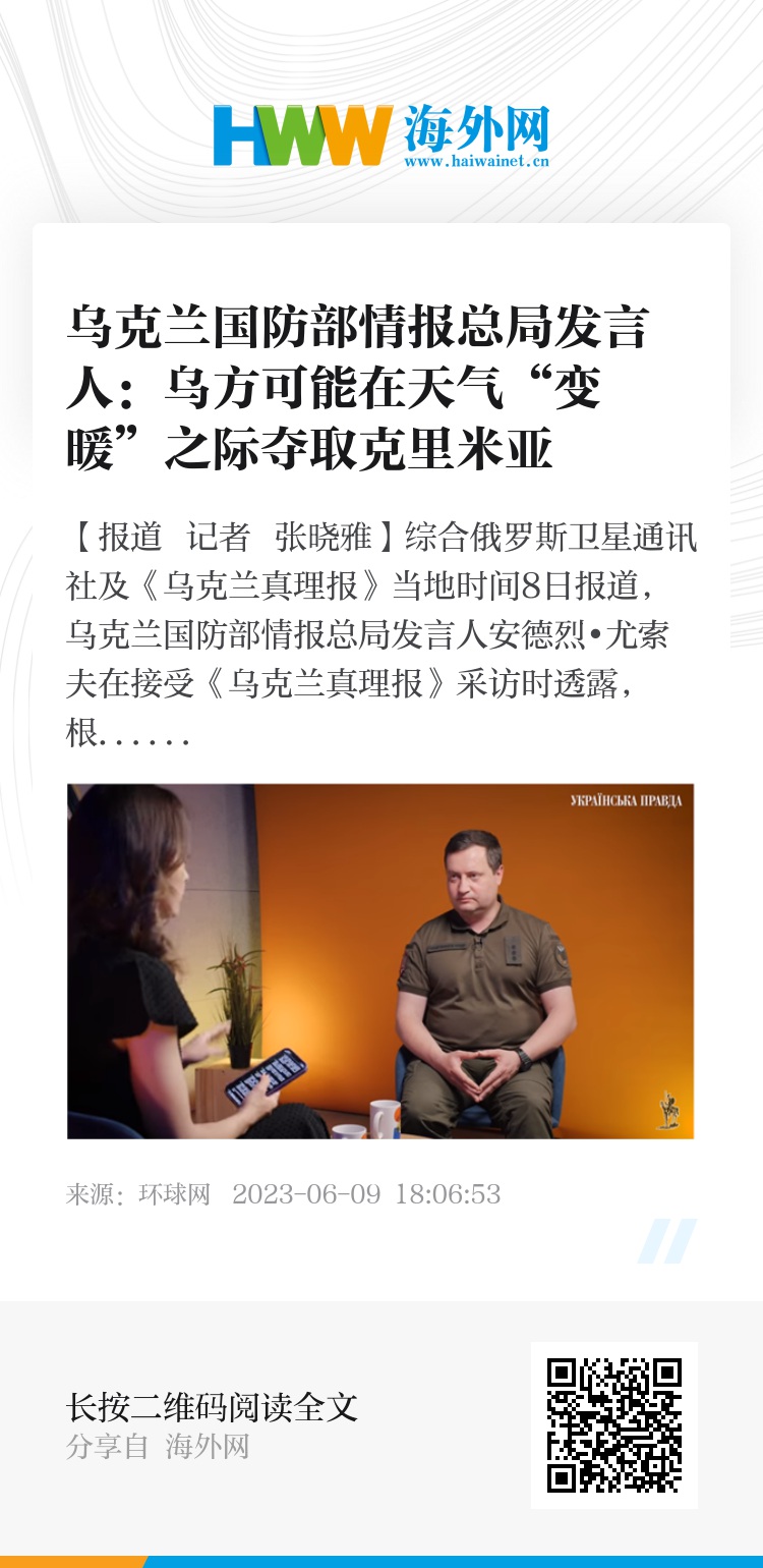 【环球网报道 记者 张晓雅】综合俄罗斯卫星通讯社及《乌克兰真理报》当地时间8日报道,乌克兰国防部情报总局发言人安德烈•尤索夫在接受《乌克兰真理报》采访时透露,根据乌克兰国防部情报总局局长布达诺夫的预测,乌“武装部队将在2023年春末进入克里米亚”只是一种可能的情况,乌方可能会有所调整。他还补充说,乌方可能会在天气“变暖”之际夺取克里米亚。