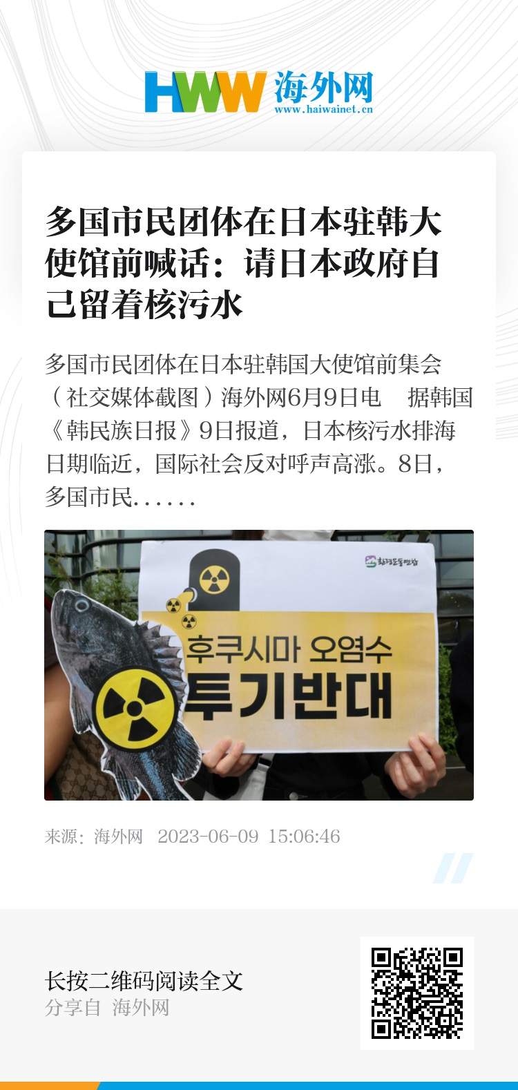 海外网6月9日电 据韩国《韩民族日报》9日报道,日本核污水排海日期临近,国际社会反对呼声高涨。8日,多国市民团体在位于韩国首尔的日本驻韩国大使馆前集会,高呼“请日本政府自己留着核污水”。