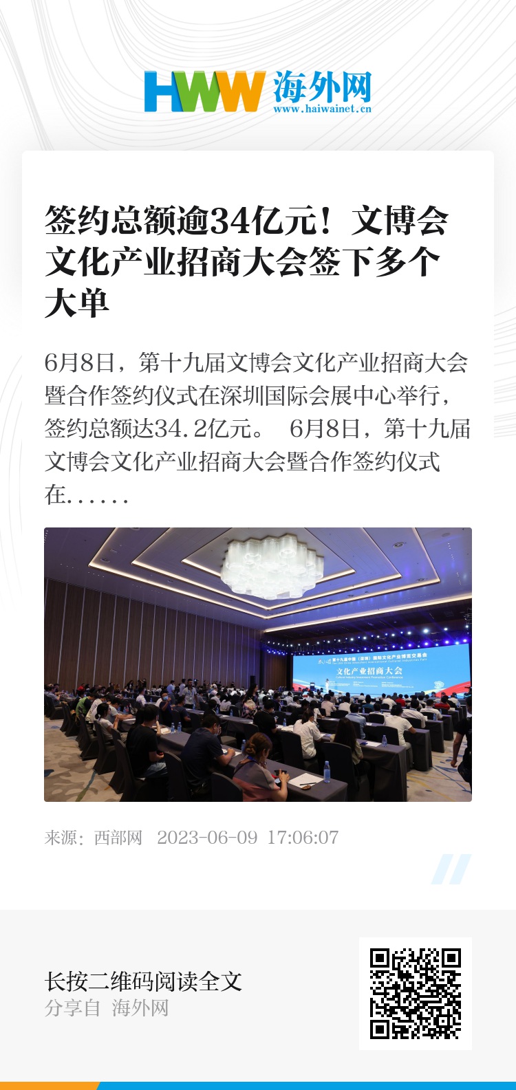 6月8日,第十九届文博会文化产业招商大会暨合作签约仪式在深圳国际会展中心举行,签约总额达34.2亿元。
