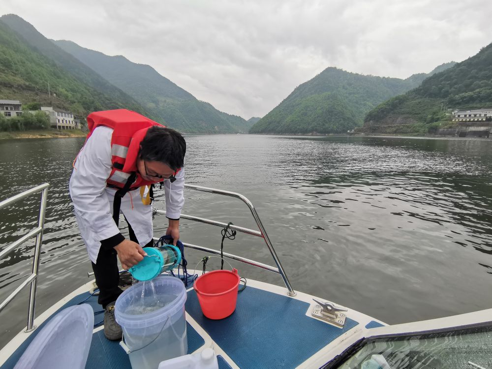 图为5月24日,生态环保工作者在新安江皖浙两省交界处,把从新安江中取出的水样倒进桶里。 新华社记者刘方强 摄