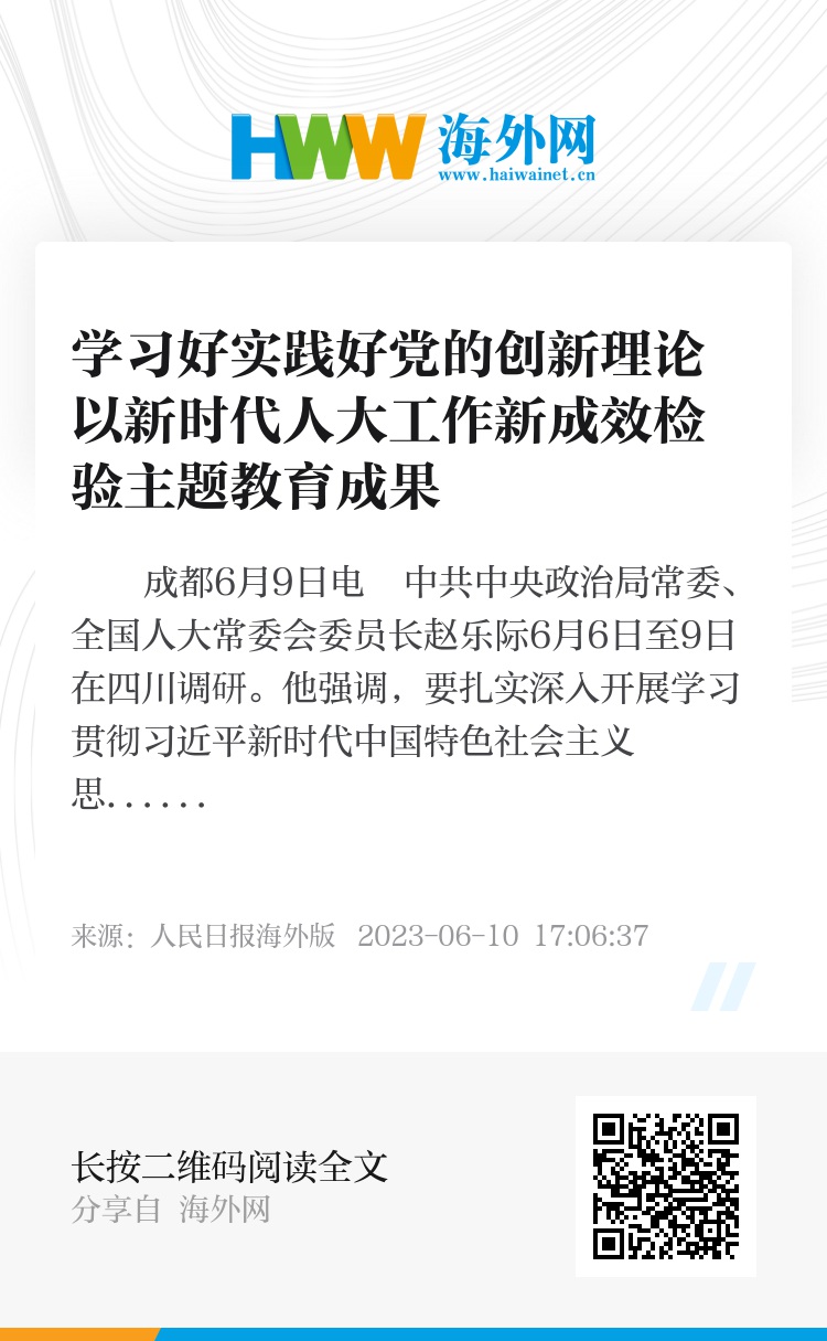 新华社成都6月9日电 中共中央政治局常委、全国人大常委会委员长赵乐际6月6日至9日在四川调研。他强调,要扎实深入开展学习贯彻习近平新时代中国特色社会主义思想主题教育,自觉用党的创新理论指导人大工作实践,高质量做好人大立法、监督、代表等各项工作,坚持好、完善好、运行好人民代表大会制度,切实做到以学铸魂、以学增智、以学正风、以学促干,以新时代人大工作新成效检验主题教育成果。