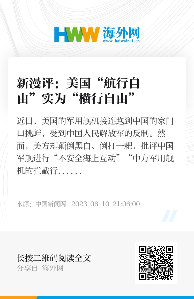 用话语霸权来扭曲事实、操纵舆论,是美国一些政客和媒体惯用的把戏。美国的军用舰机不远万里跑到中国的家门口挑衅,执意到中国领海领空附近搞什么抵近侦察、耀武扬威,却反过来指责中国反应过度?正如外交部发言人汪文斌所说,这不是维护“航行自由”,而是在推行“航行霸权”,是赤裸裸的军事挑衅行为,这种霸权行径才是造成海空安全风险的根源。
