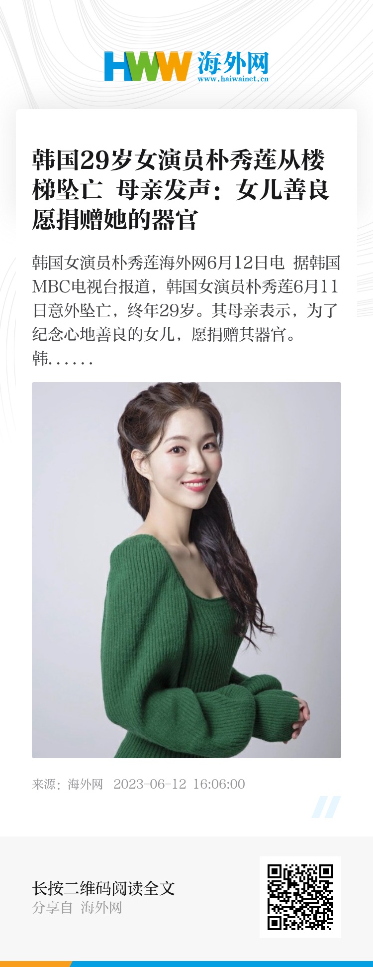 海外网6月12日电 据韩国MBC电视台报道,韩国女演员朴秀莲6月11日意外坠亡,终年29岁。其母亲表示,为了纪念心地善良的女儿,愿捐赠其器官。