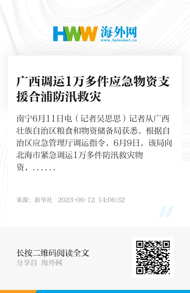 新华社南宁6月11日电(记者吴思思)记者从广西壮族自治区粮食和物资储备局获悉,根据自治区应急管理厅调运指令,6月9日,该局向北海市紧急调运1万多件防汛救灾物资,支持北海市合浦县开展防汛救灾工作。