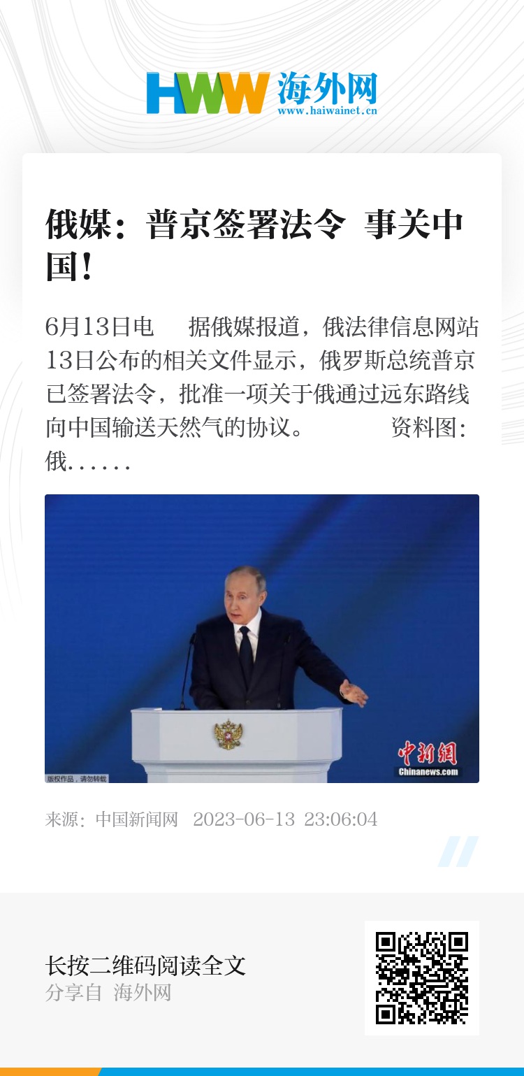 报道称,俄通过远东路线向中国输送天然气协议于2023年1月31日签署,俄罗斯国家杜马(议会下院)与联邦委员会(议会上院)分别于5月31日和6月7日批准该协议。