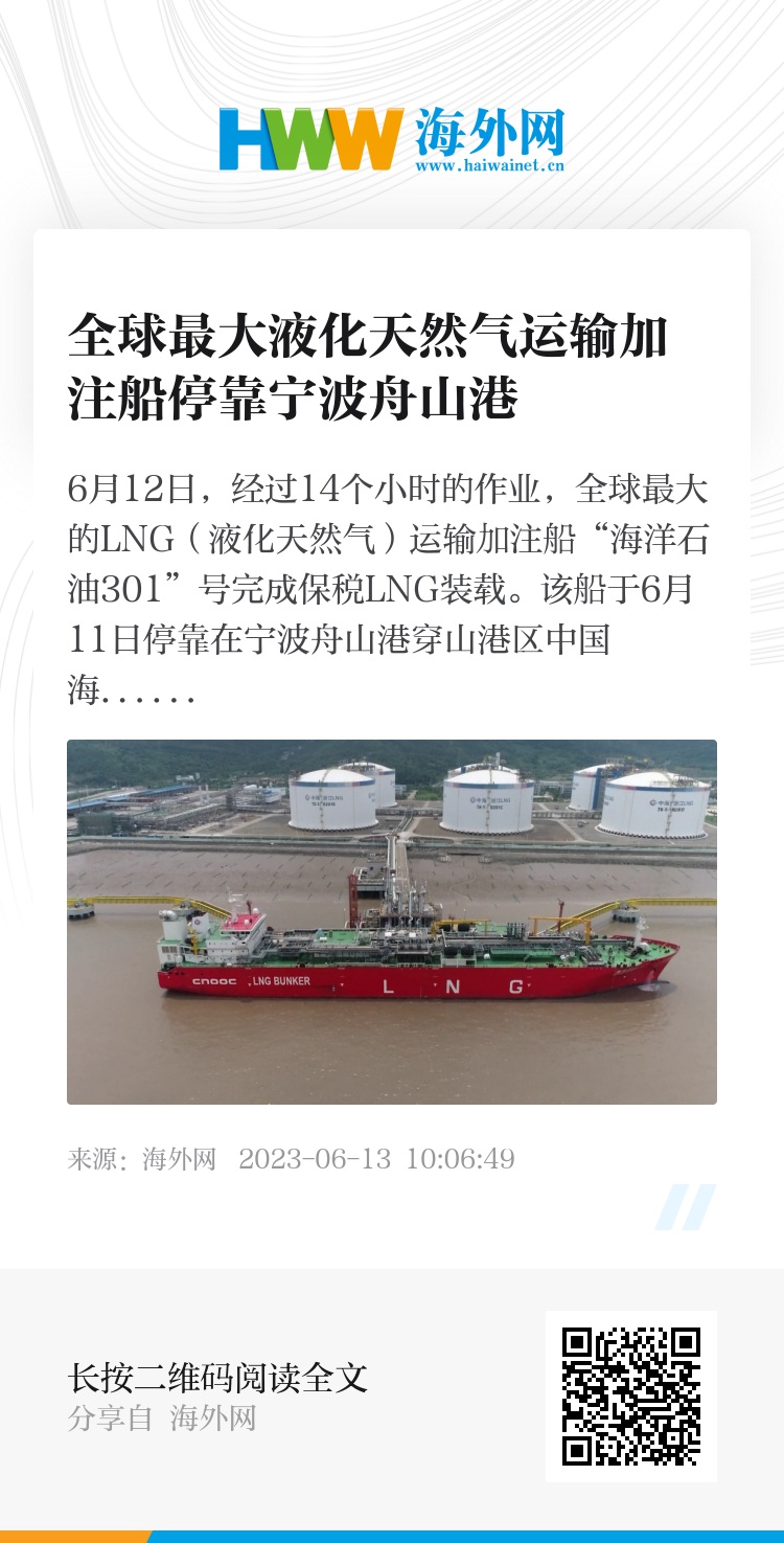 6月12日,经过14个小时的作业,全球最大的LNG(液化天然气)运输加注船“海洋石油301”号完成保税LNG装载。该船于6月11日停靠在宁波舟山港穿山港区中国海油宁波“绿能港”码头开始装载作业,该码头也成为浙江首家为LNG加注船提供保税LNG的接收站,为浙江自由贸易试验区油气全产业链开放发展提供有力支持。图片来源:CCTV+/视觉中国