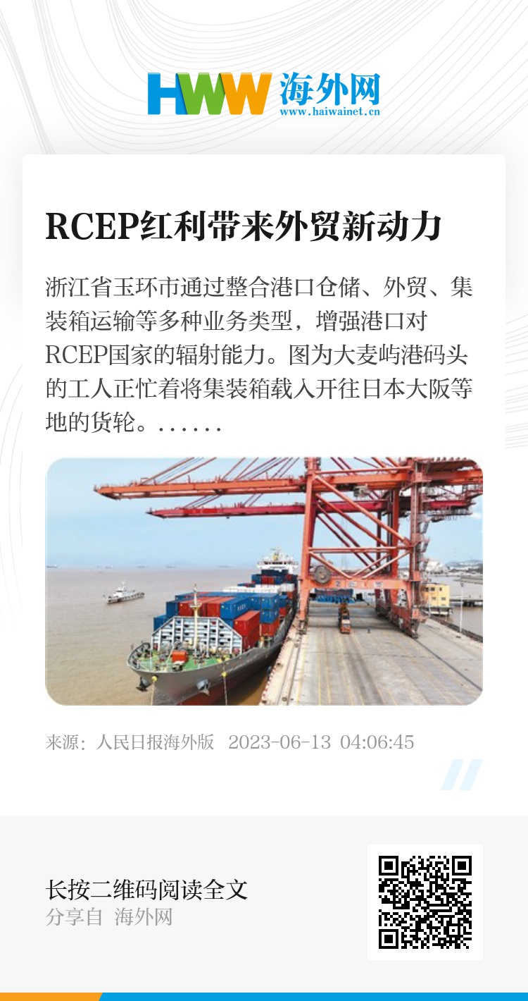 浙江省玉环市通过整合港口仓储、外贸、集装箱运输等多种业务类型,增强港口对RCEP国家的辐射能力。图为大麦屿港码头的工人正忙着将集装箱载入开往日本大阪等地的货轮。段俊利摄(人民视觉)