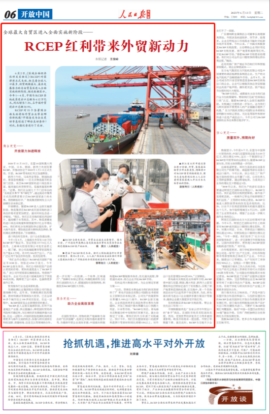 南宁海关关长王味冰说,广西是中国与东盟开放合作前沿和窗口,与包括东盟在内的RCEP各成员国深化开放合作将激发更多发展红利。南宁海关将积极推动优势产品扩大出口和关键技术进口,不断扩大RCEP政策红利覆盖面,推动“中国—东盟自由贸易区3.0版”建设升级,支持广西把独特区位优势转化为开放发展优势。