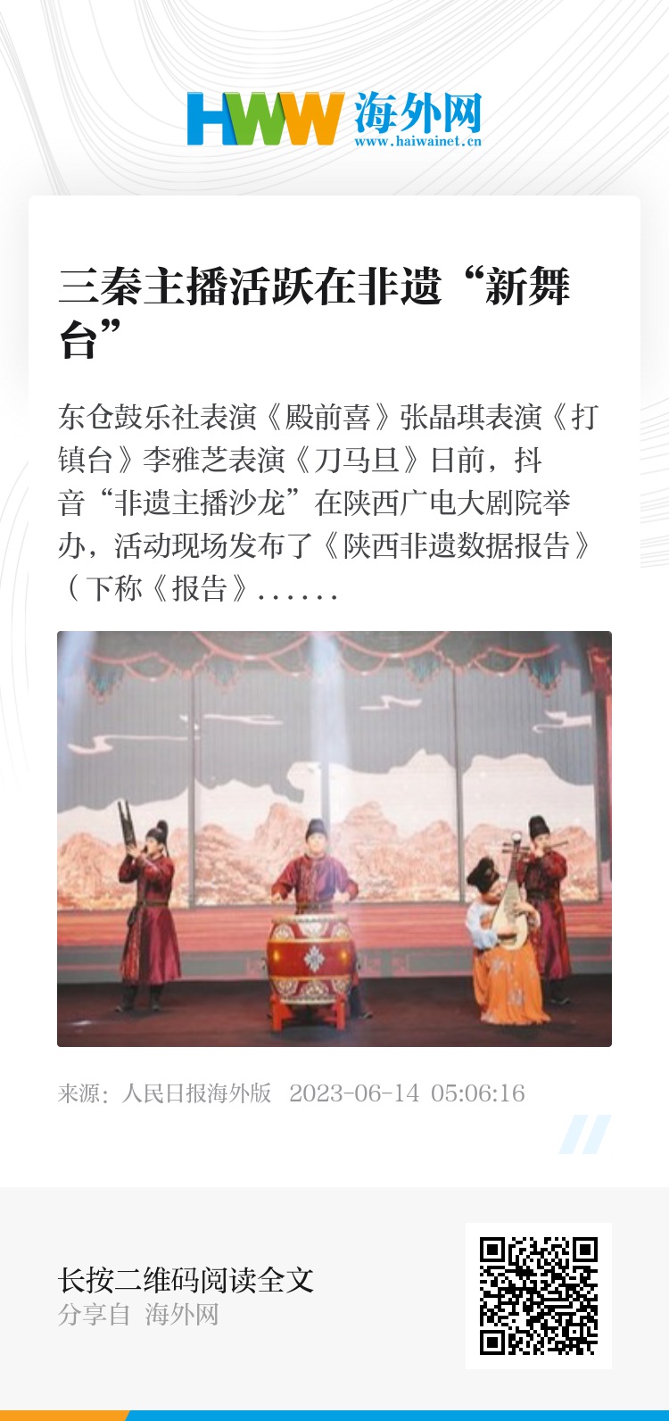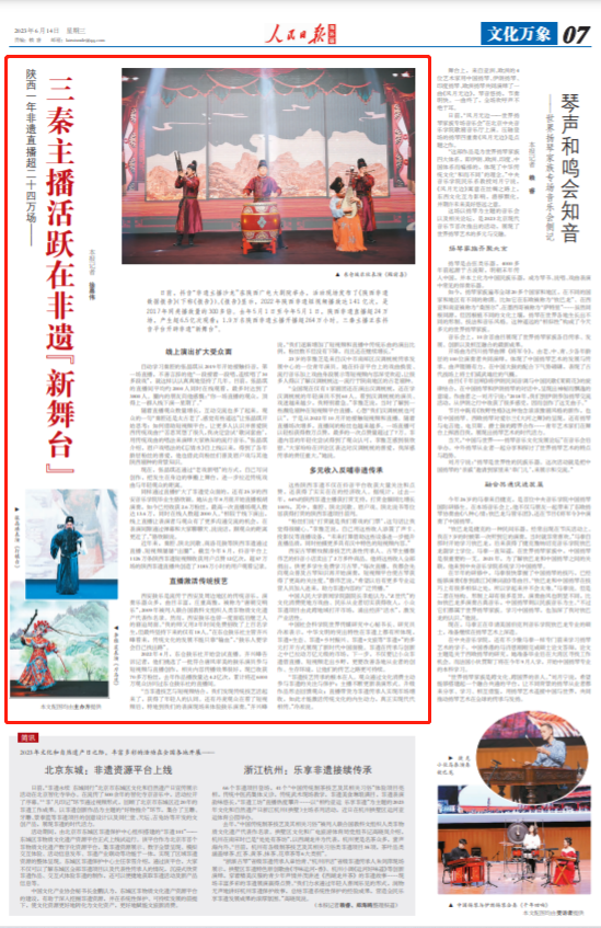 近年来,秦腔、陕北民歌、商洛花鼓等陕西非遗通过直播、短视频屡屡“出圈”。截至今年5月,抖音平台上1126万条陕西非遗短视频收获用户点赞12亿次,超57万场的陕西非遗直播共创造了3185万小时的用户观看记录。