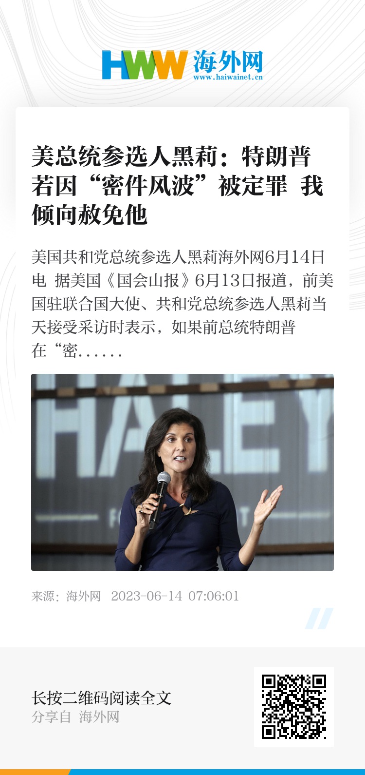 海外网6月14日电 据美国《国会山报》6月13日报道,前美国驻联合国大使、共和党总统参选人黑莉当天接受采访时表示,如果前总统特朗普在“密件风波”中被定罪,她倾向于赦免特朗普。
