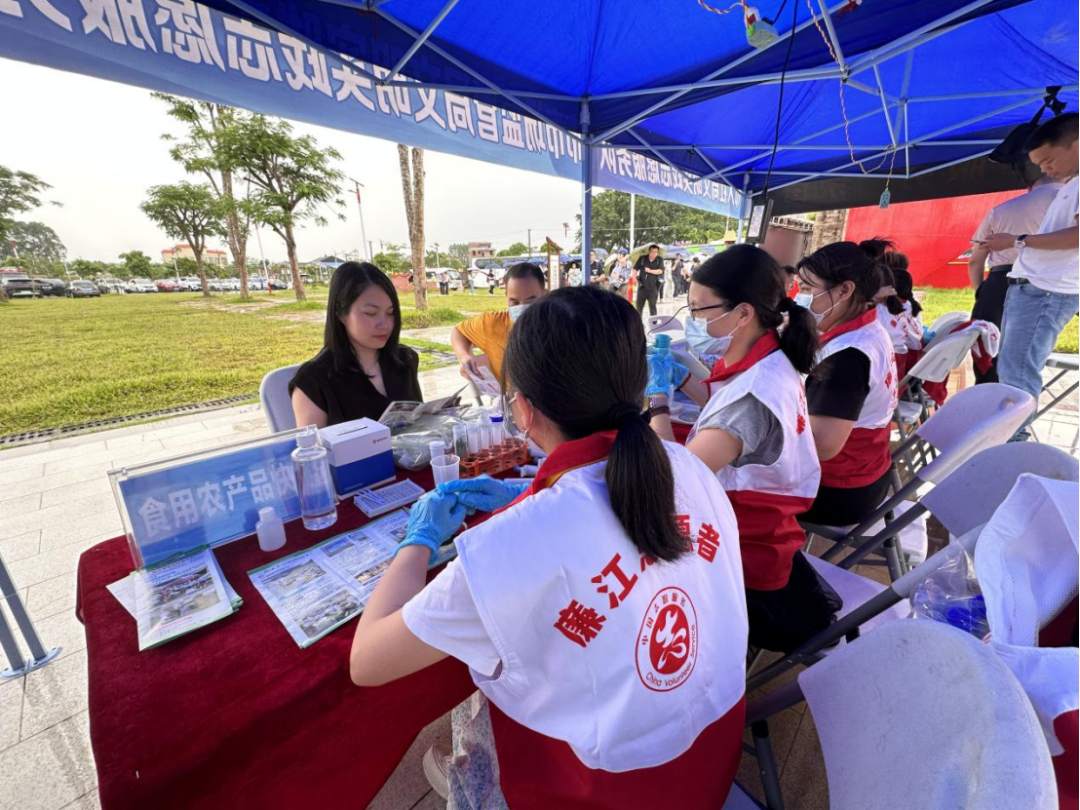 广场一侧,几排桌椅展开,水柱不时从雨棚边上汇流而下。“业务可以现场办”,入口处第一张长桌上,廉江市社保局的志愿者正手把手教一位老人操作“粤省事”小程序。紧挨的另一张桌上,码放着采摘包装好的新鲜蔬菜,来自廉江市市场监管局检验检测中心的工作人员熟练操作试管试剂,测量农药残留等数值。