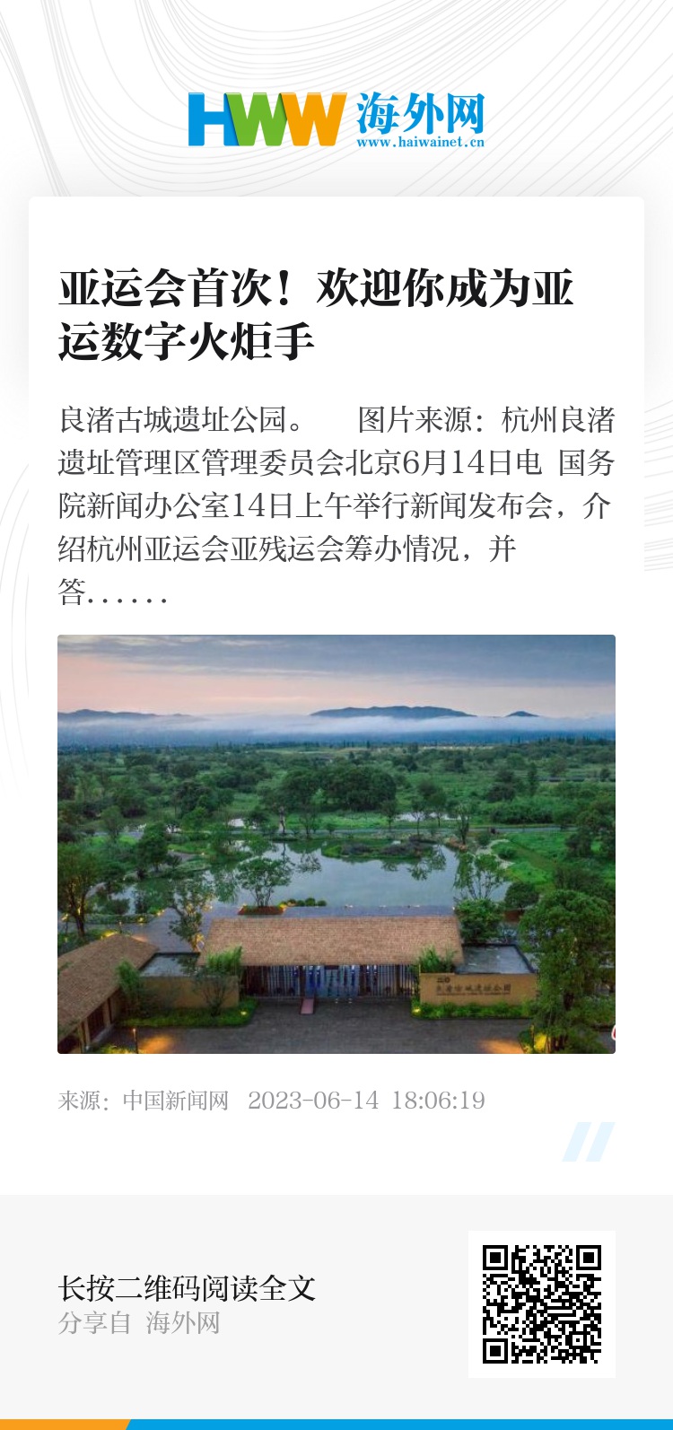 中新网北京6月14日电 国务院新闻办公室14日上午举行新闻发布会,介绍杭州亚运会亚残运会筹办情况,并答记者问。会上介绍,杭州亚运会火种采集仪式将于15日在良渚古城遗址举行。