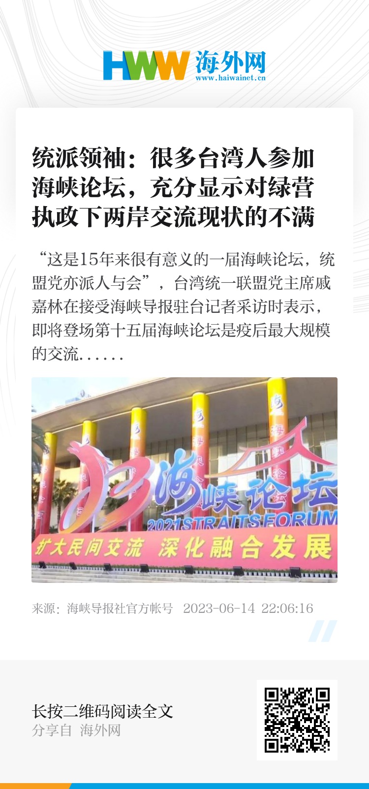 “这是15年来很有意义的一届海峡论坛,统盟党亦派人与会”,台湾统一联盟党主席戚嘉林在接受海峡导报驻台记者采访时表示,即将登场第十五届海峡论坛是疫后最大规模的交流盛会,也是美国对中国大陆全方位打压、勾结民进党操弄“反中”背景下所举办的一次两岸活动,受到岛内社会的关注,很多台胞报名参加了此次论坛。