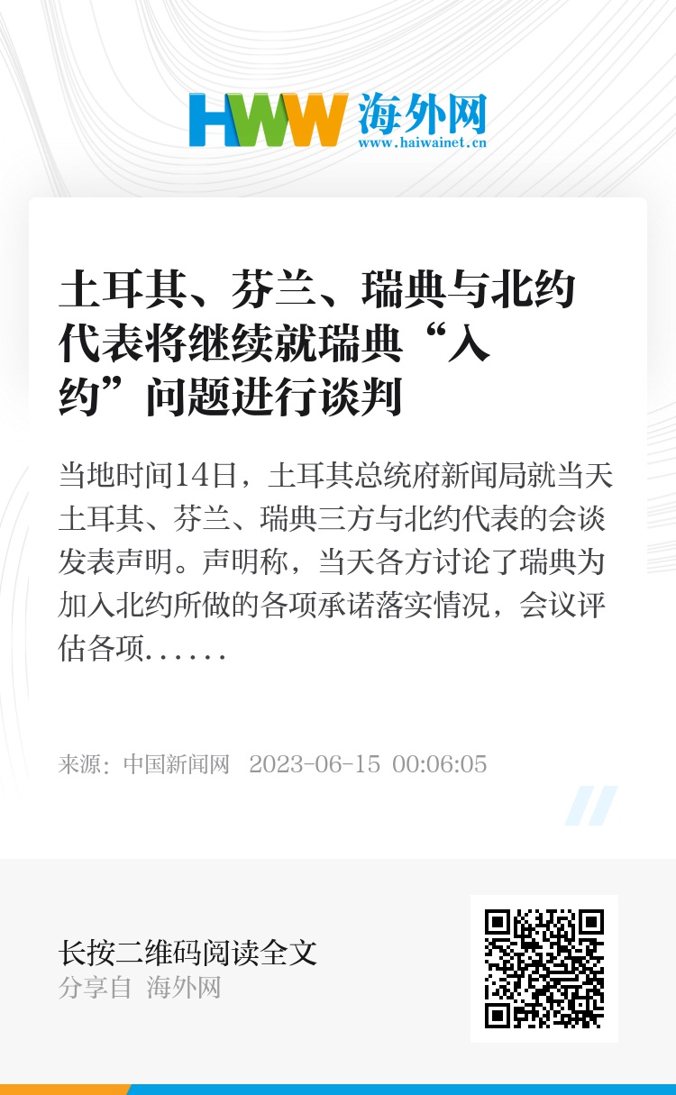 另据路透社报道,瑞典代表斯坦斯特罗姆会后表示,瑞典将继续与土耳其就“入约”问题进行谈判。瑞典方面认为其已履行各项职责,但土耳其方面认为,土方还需就其关切问题得到更多答案。(央视新闻客户端 总台记者 梁慧)