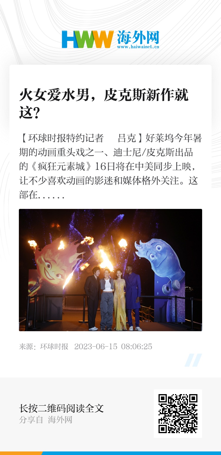 【环球时报特约记者 吕克】好莱坞今年暑期的动画重头戏之一、迪士尼/皮克斯出品的《疯狂元素城》16日将在中美同步上映,让不少喜欢动画的影迷和媒体格外关注。这部在立意、手法上与《头脑特工队》和《疯狂动物城》颇为相近的新作,能否赢得观众的喜爱,如今的主流合家欢动画如何突破狭隘的价值观,这都是好莱坞创作者不得不思考的问题。