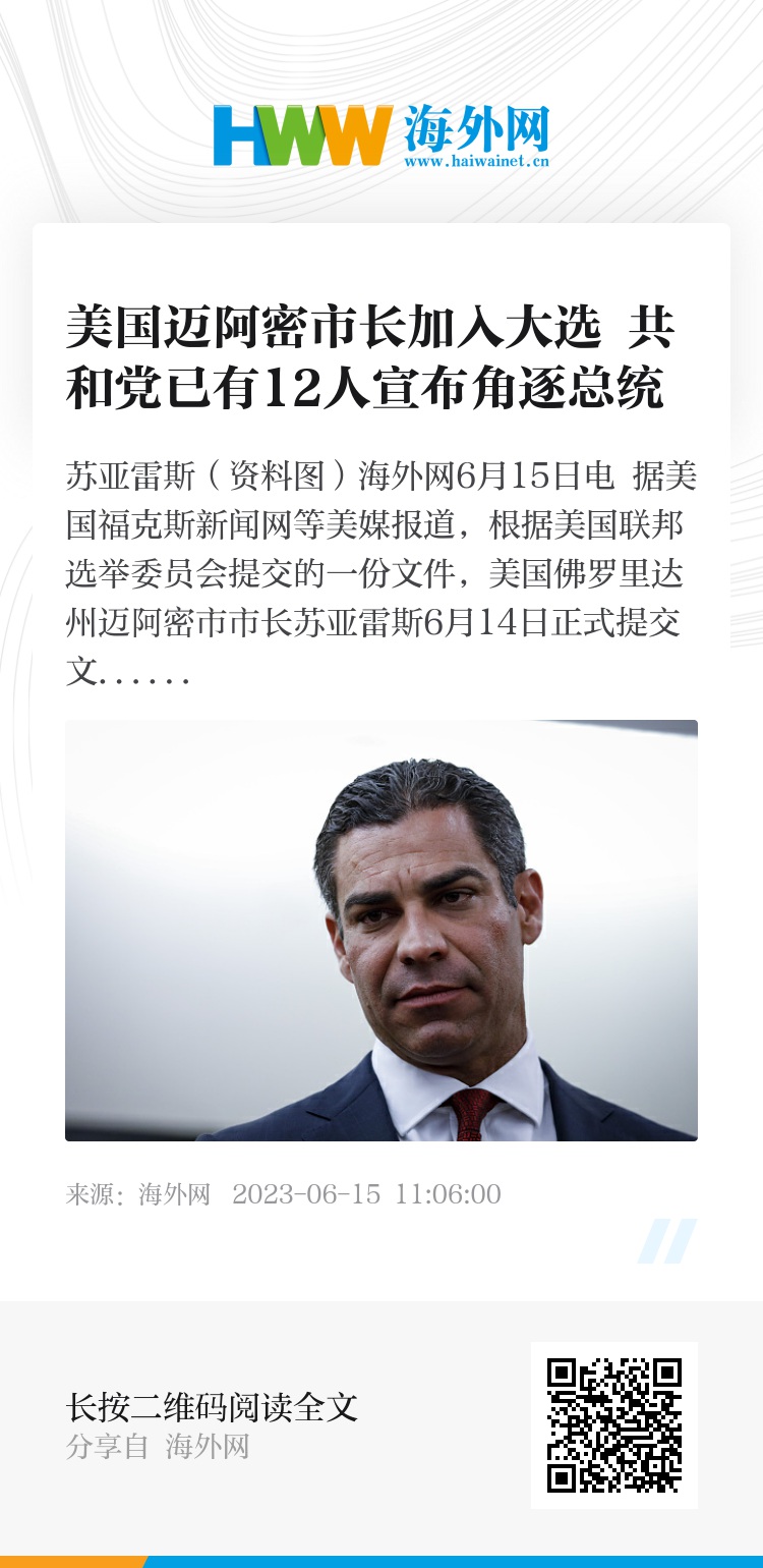 海外网6月15日电 据美国福克斯新闻网等美媒报道,根据美国联邦选举委员会提交的一份文件,美国佛罗里达州迈阿密市市长苏亚雷斯6月14日正式提交文件,宣布将以共和党人的身份参加2024年美国总统竞选。