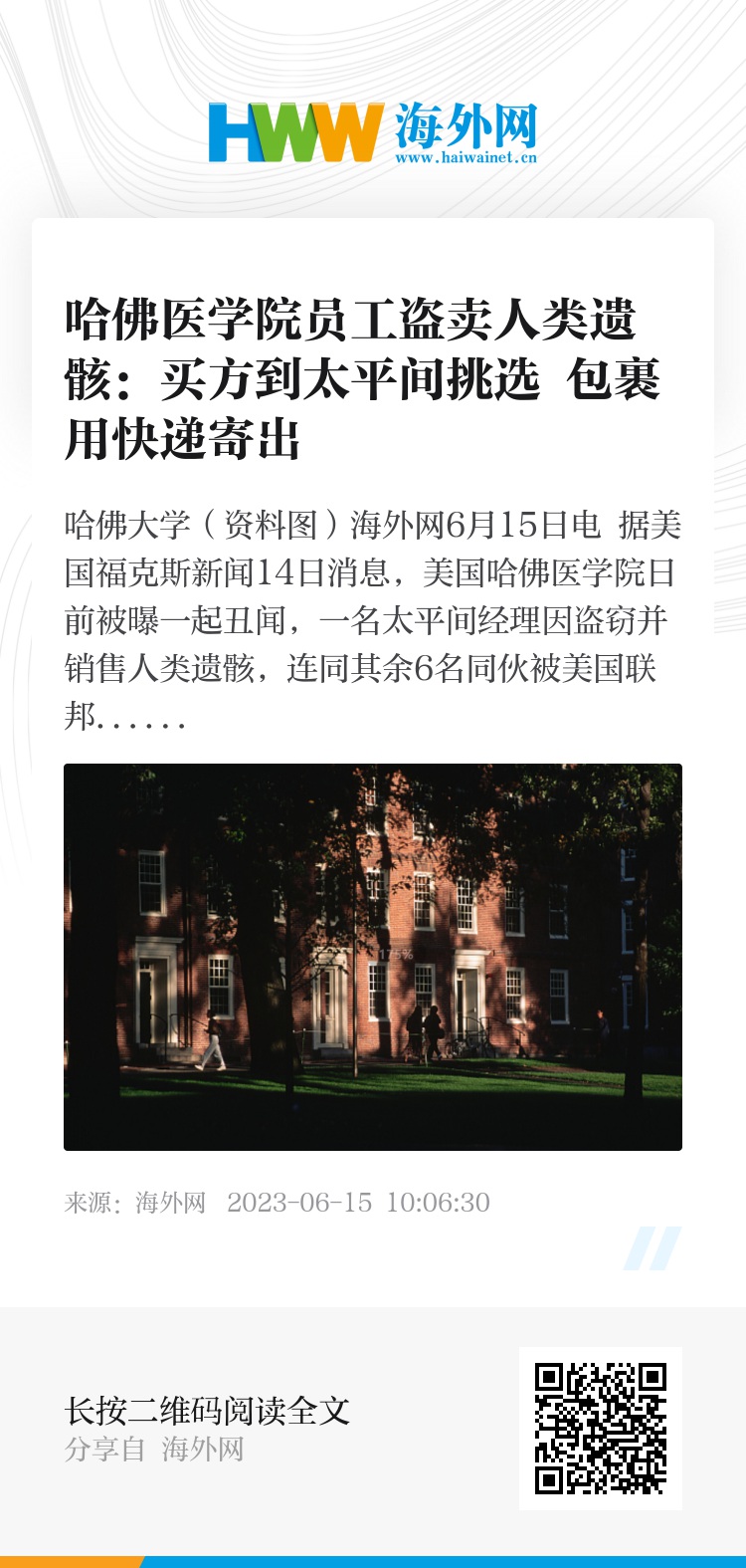 哈佛医学院在一份声明中表示,得知如此令人不安的事件发生在校园十分震惊,该事件是对医学院的背叛,对于给遗体捐赠者家属造成的痛苦,感到非常抱歉。太平间经理洛奇于1995年被哈佛医学院聘用,2023年5月6日已被解雇。(海外网 李萌)