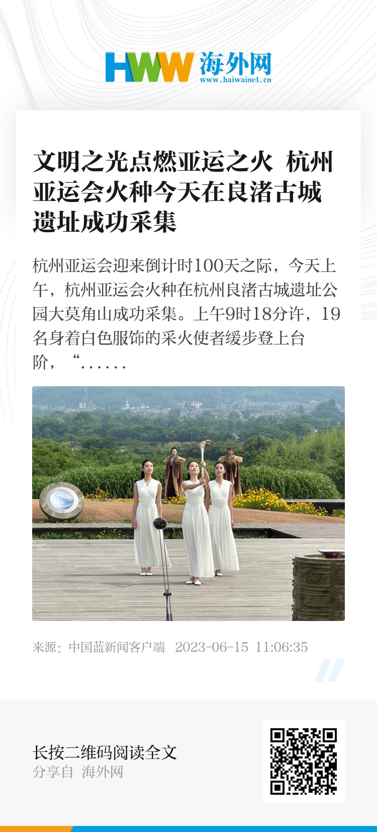 杭州亚运会迎来倒计时100天之际,今天上午,杭州亚运会火种在杭州良渚古城遗址公园大莫角山成功采集。