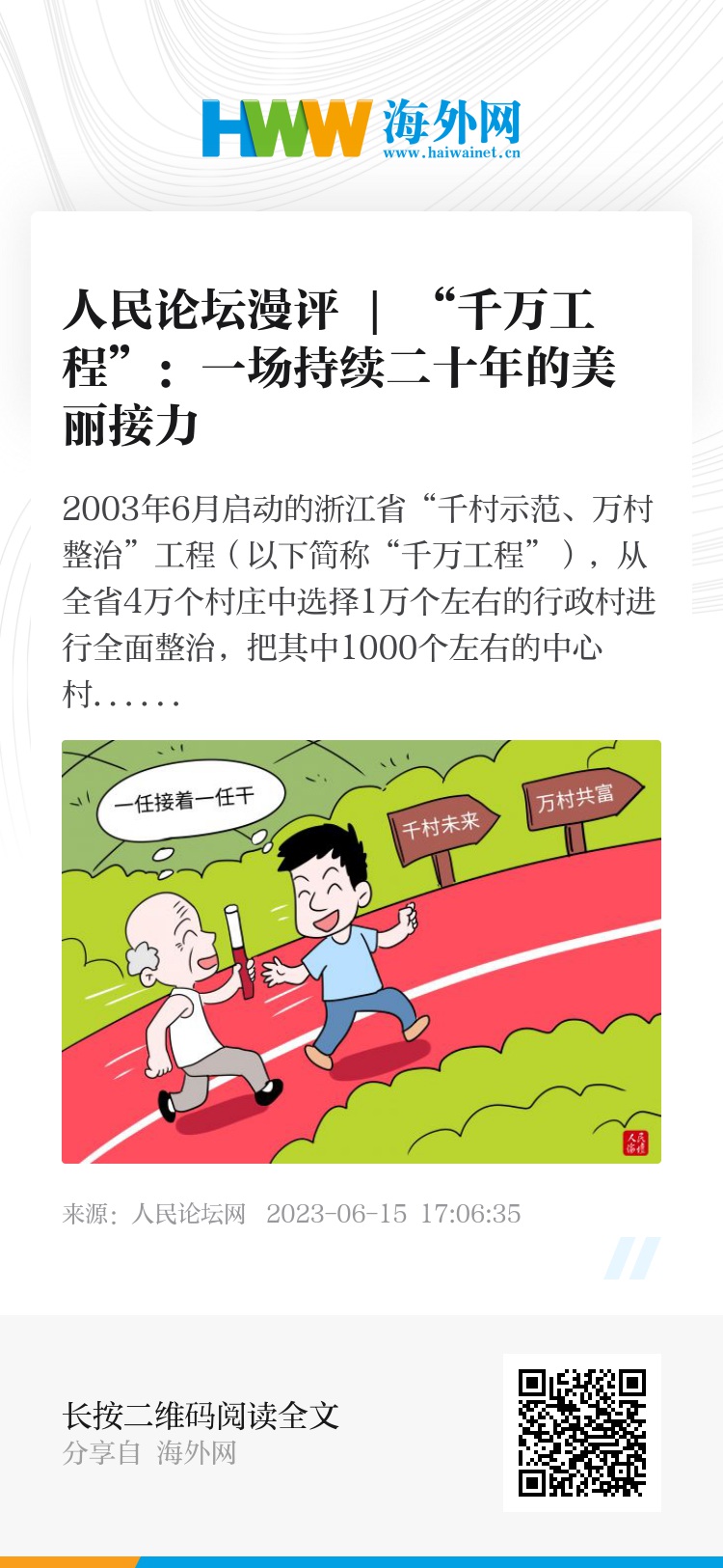 百倍其功,终必有成。千秋大业不可能在一代人手上完成,浙江“千万工程”描绘的中国乡村新画卷让世界看到,以绿色为底色的中国式现代化,走的是经济发展和生态环境保护共赢之路,绘就出“千村向未来、万村奔共富、城乡促融合、全域创和美”的现代版“富春山居图”。循着这条路向前,广大党员干部要深入总结经验,保持历史耐心和战略定力,掌握好“千万工程”所蕴含的科学思想与方法,切实将其转化为贯彻新发展理念、加快城乡融合发展、推动美丽中国建设、全面推进乡村振兴的生动实践。