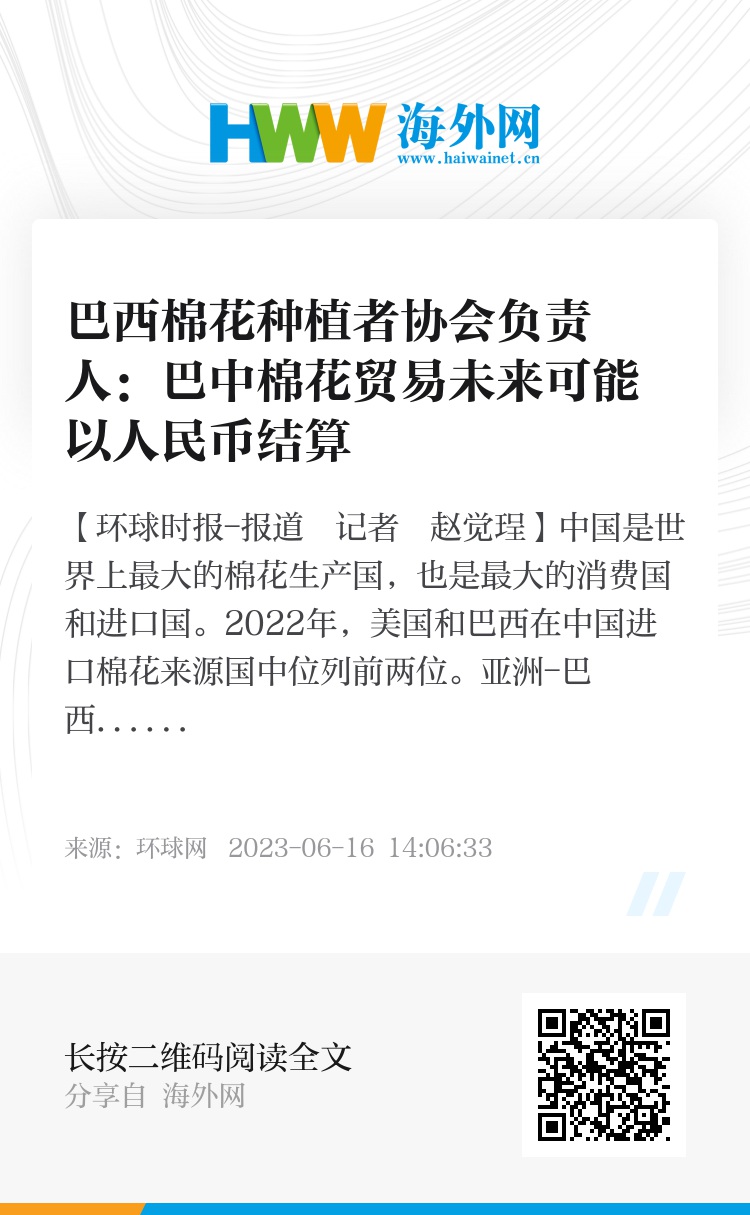 【环球时报-环球网报道 记者 赵觉珵】中国是世界上最大的棉花生产国,也是最大的消费国和进口国。2022年,美国和巴西在中国进口棉花来源国中位列前两位。亚洲-巴西农业联盟(ABAA)CEO、巴西棉花种植者协会(ABRAPA)国际关系总监马塞洛·杜阿特·蒙特罗16日对《环球时报》记者预测,巴西棉花对华出口量在未来几年有望超过美国,并且可能以人民币直接进行结算。
