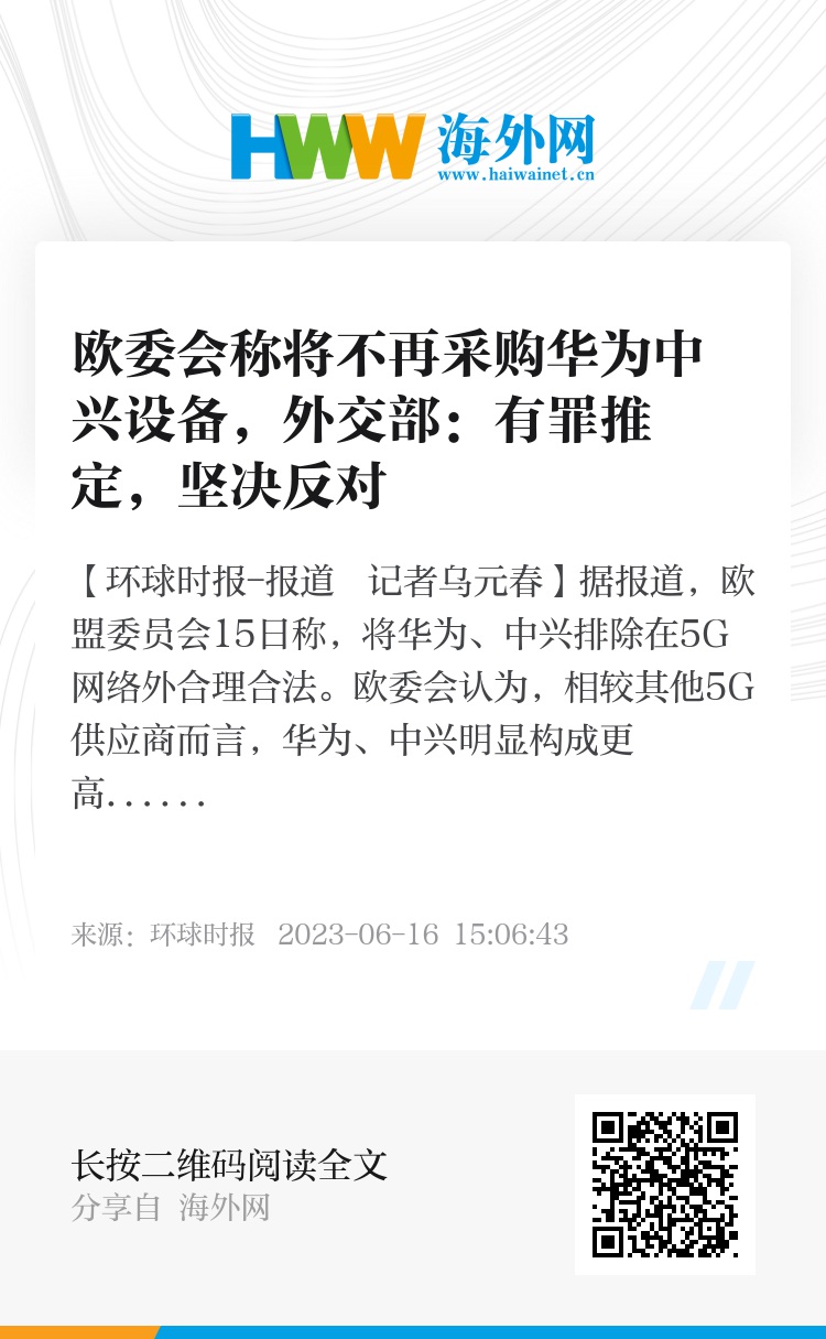 在6月16日中国外交部例行记者会上,发言人汪文斌在回应外媒记者相关提问时表示,欧盟委员会说华为、中兴等中国通信企业存在安全风险,却拿不出任何证据,这是典型的有罪推定。中方对此坚决反对。