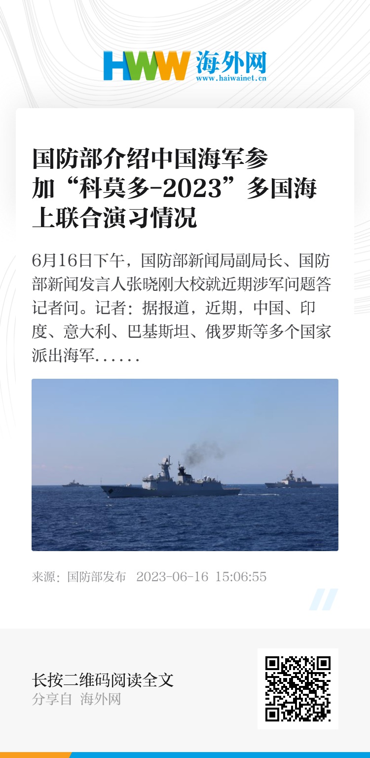 张晓刚:应印度尼西亚海军邀请,6月5日至8日,中国海军导弹驱逐舰湛江舰、导弹护卫舰许昌舰组成舰艇编队,在印尼望加锡市及附近海域参加了“科莫多-2023”多国海上联合演习。