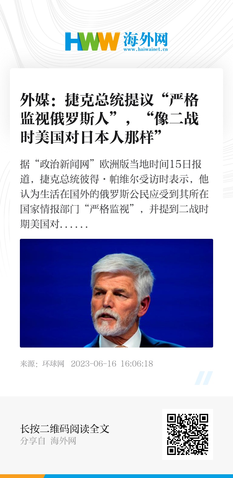 据“政治新闻网”欧洲版当地时间15日报道,捷克总统彼得·帕维尔受访时表示,他认为生活在国外的俄罗斯公民应受到其所在国家情报部门“严格监视”,并提到二战时期美国对在美日本人的监视措施。“今日俄罗斯”网站称,帕维尔的意思是,现在西方应像美国二战时对待日本人那样对待在本国的俄罗斯人。