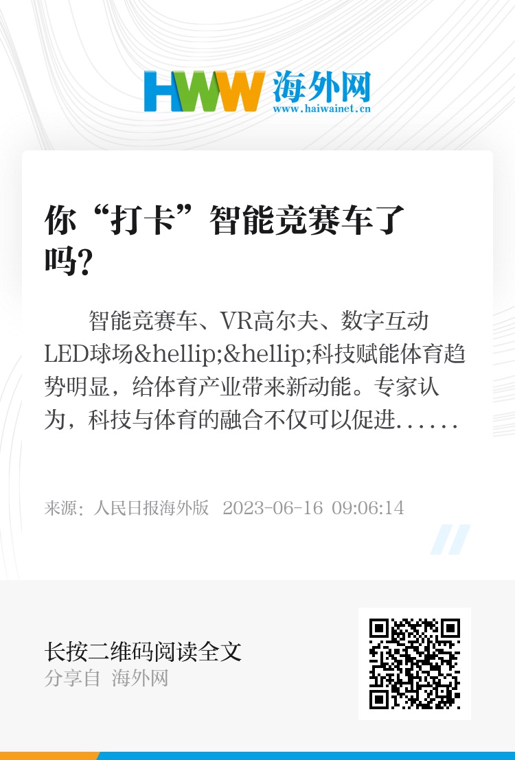 智能竞赛车、VR高尔夫、数字互动LED球场……科技赋能体育趋势明显,给体育产业带来新动能。专家认为,科技与体育的融合不仅可以促进竞技体育的高质量发展,也有助于人们健身方式的科学化、数字化和安全性。