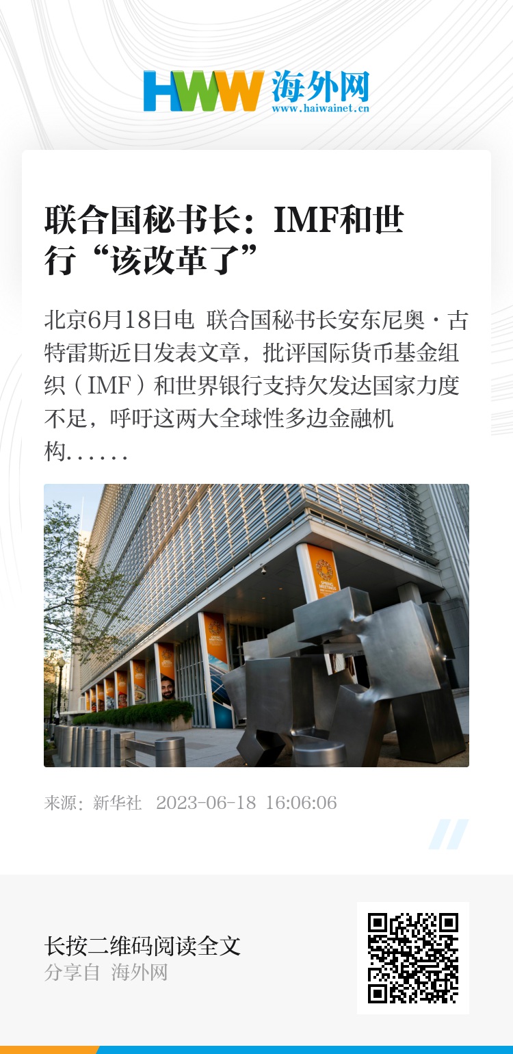 新华社北京6月18日电 联合国秘书长安东尼奥·古特雷斯近日发表文章,批评国际货币基金组织(IMF)和世界银行支持欠发达国家力度不足,呼吁这两大全球性多边金融机构大刀阔斧改革。