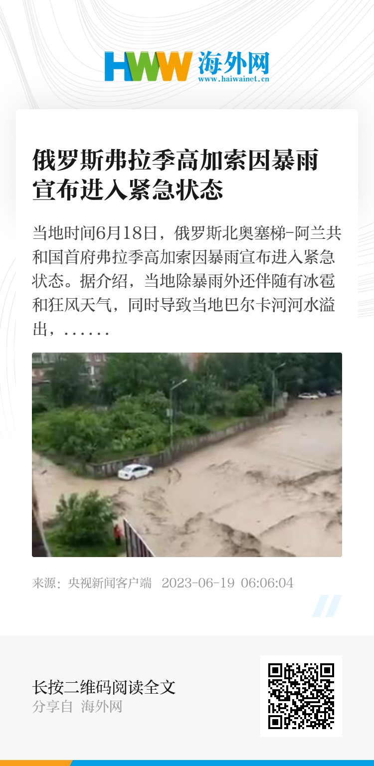 据介绍,当地除暴雨外还伴随有冰雹和狂风天气,同时导致当地巴尔卡河河水溢出,弗拉季高加索市内多处被淹。当地紧急情况部门正在对暴雨导致的部分居民点的受损输电线路进行抢修。(总台记者 张誉耀)