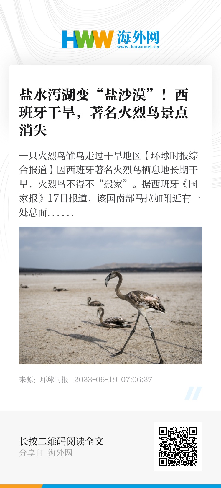 【环球时报综合报道】因西班牙著名火烈鸟栖息地长期干旱,火烈鸟不得不“搬家”。据西班牙《国家报》17日报道,该国南部马拉加附近有一处总面积达1400公顷的盐水泻湖,是伊比利亚半岛最大的火烈鸟栖息地和欧洲第二大火烈鸟栖息地,通常每年都会吸引大量美丽的火烈鸟来此孕育后代,同时也是著名旅游胜地之一。 据统计,去年来到这里的火烈鸟超过1.7万只,在此孕育火烈鸟宝宝近4000只。然而受旱情影响,今年的泻湖变成了“盐沙漠”,虽然也有一些鸟类继续来到此地,却只能看到寥寥数十只火烈鸟。据悉,每年夏季泻湖中的水都会大量蒸发,不过随着雨季到来,水位基本能复原。不过,近年来持续干旱少雨,泻湖水量“回血”不足,为火烈鸟而来的游客随之大大减少。这是进入21世纪以来该泻湖首次濒临干涸,与此同时,旱情也导致周边地区的橄榄树和其他作物遭受损失。(汪品植)