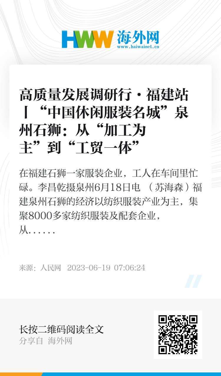 人民网泉州6月18日电 (苏海森)福建泉州石狮的经济以纺织服装产业为主,集聚8000多家纺织服装及配套企业,从业人员超16万人,拥有限上纺织服装企业超过500家,年交易额超千亿元,荣获“中国休闲服装名城”“全国纺织模范产业集群”和“中国服装产业示范集群”“全国十大布料市场”“全国十大服装批发市场”等称号。