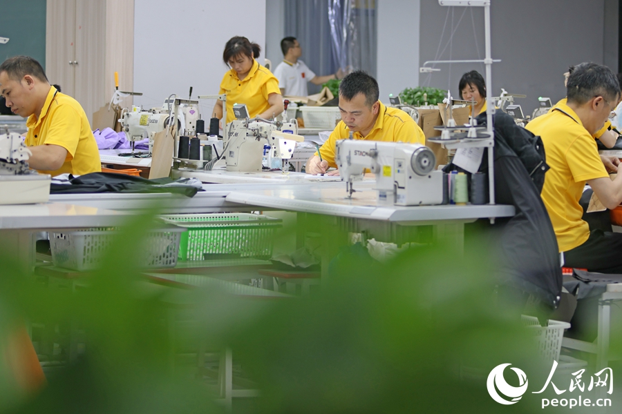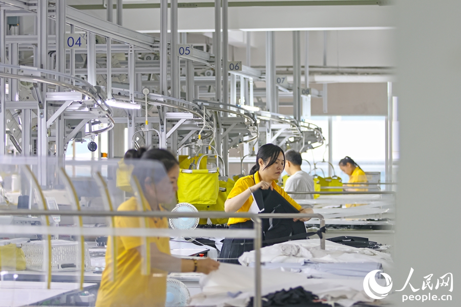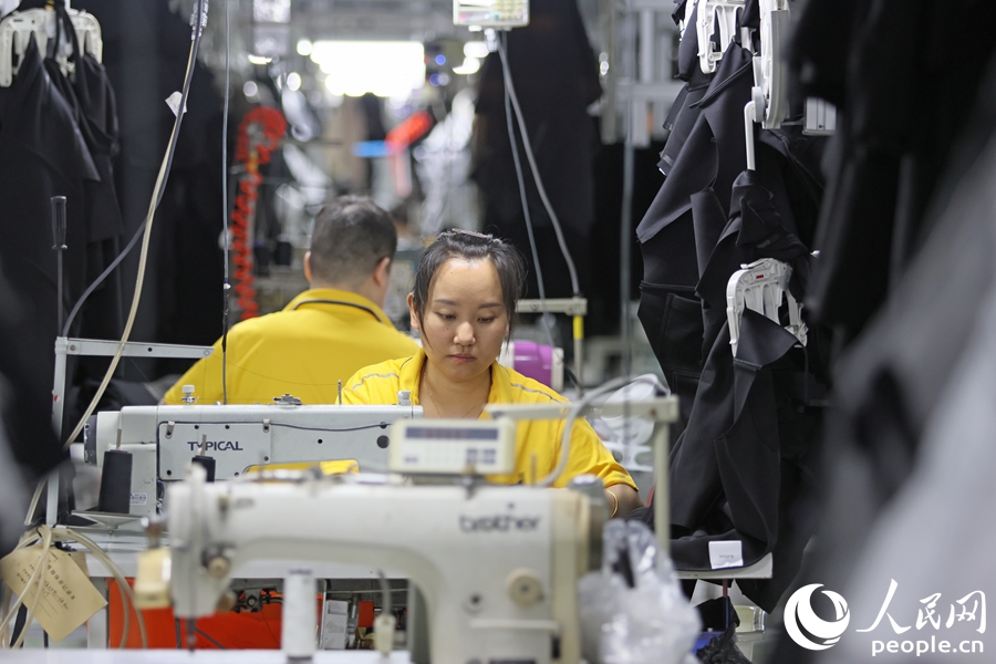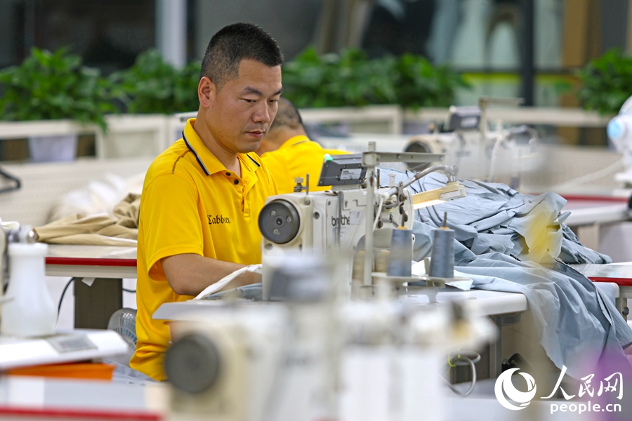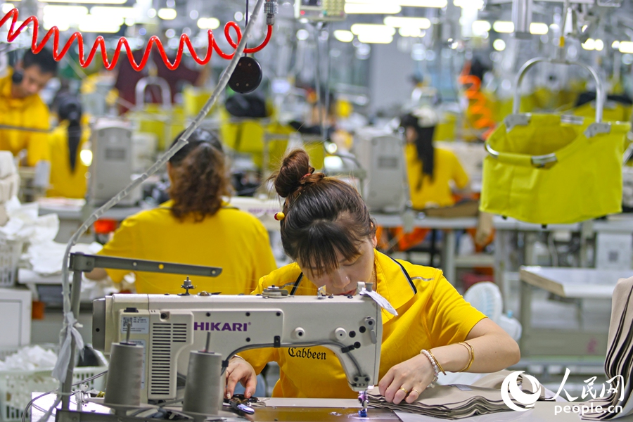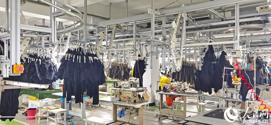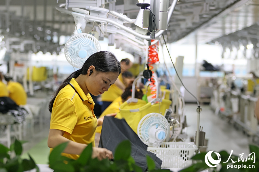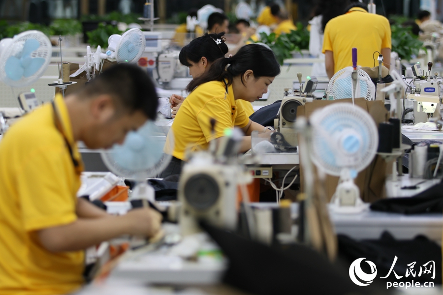 在福建石狮一家服装企业,工人在车间里忙碌。李昌乾摄