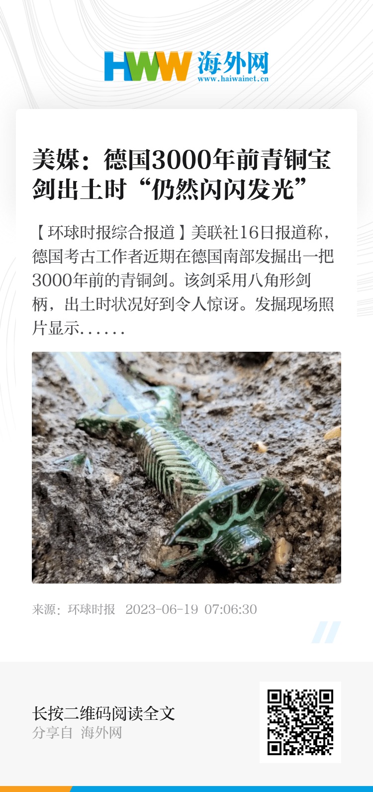 考古工作者表示,几千年过去了,该剑“仍然闪闪发光”。据了解,该剑出土地点是位于德国南部纽伦堡和斯图加特两座主要城市之间一处小镇的一座坟墓,该墓共埋葬三人,包括一对成年男女和一名男孩,他们是在较短的时间间隔内分别被下葬的,陪葬品有若干青铜器皿,三人关系已不可考。这把剑铸造于公元前14世纪,当地在当时已进入青铜时代中期。考古工作者表示,出土状况这么好的青铜剑实属少见,也展现出先民所具备的生产青铜武器装备的精湛工艺。下一步,考古工作者还会对这把青铜剑以及该墓葬做进一步的研究。(李 飞)