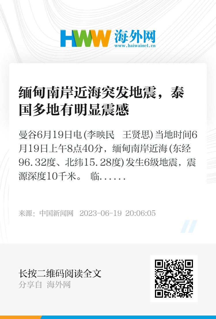 中新网曼谷6月19日电(李映民 王贤思)当地时间6月19日上午8点40分,缅甸南岸近海(东经96.32度、北纬15.28度)发生6级地震,震源深度10千米。