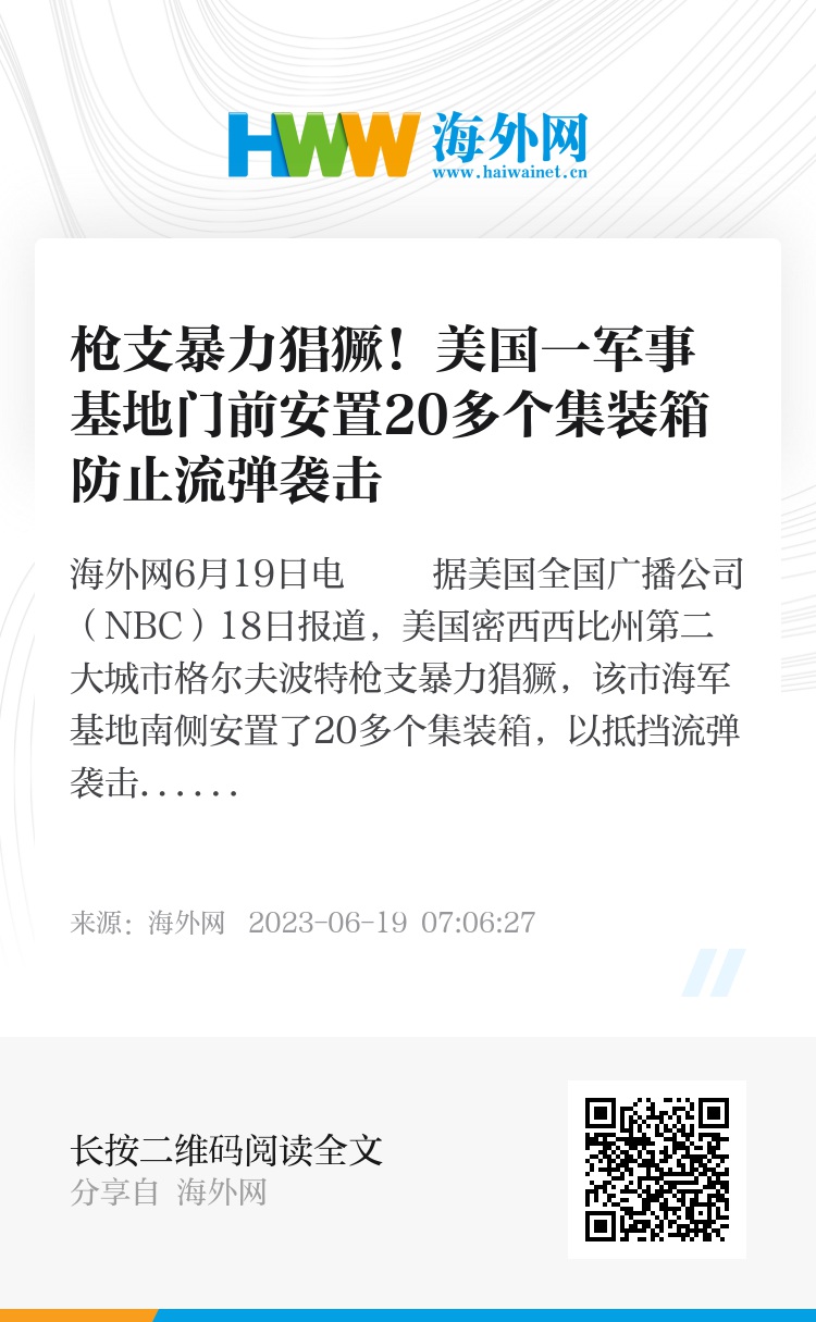 海外网6月19日电 据美国全国广播公司(NBC)18日报道,美国密西西比州第二大城市格尔夫波特枪支暴力猖獗,该市海军基地南侧安置了20多个集装箱,以抵挡流弹袭击。