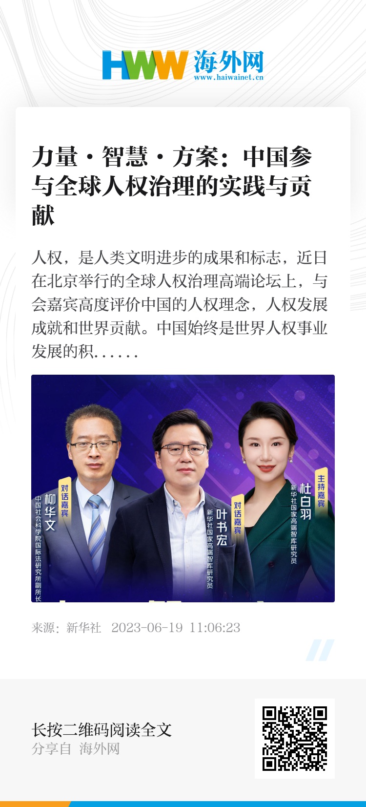 中国始终是世界人权事业发展的积极参与者和重要推动者,同时,也为全球人权治理贡献了中国智慧、中国方案。新华社国家高端智库研究员叶书宏和中国社会科学院国际法研究所副所长柳华文将在本集《新华智策》中共同探讨中国参与全球人权治理的实践与贡献。