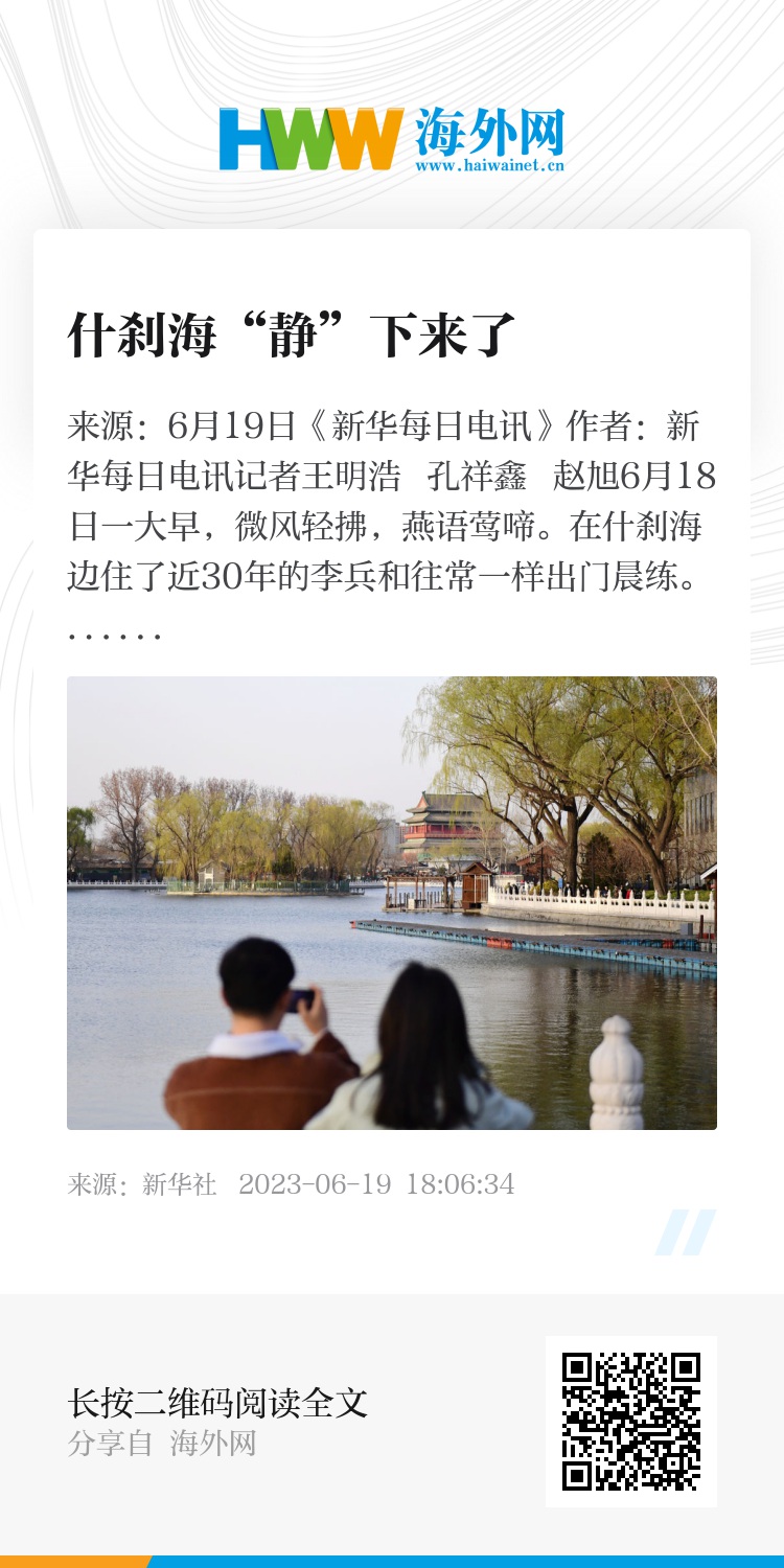 6月18日一大早,微风轻拂,燕语莺啼。在什刹海边住了近30年的李兵和往常一样出门晨练。环湖快走,惬意呼吸,不时跟遛早的老街坊们打着招呼,“不用再走‘冤枉路’,没闹事儿的,望山见水,心里熨帖得很!”