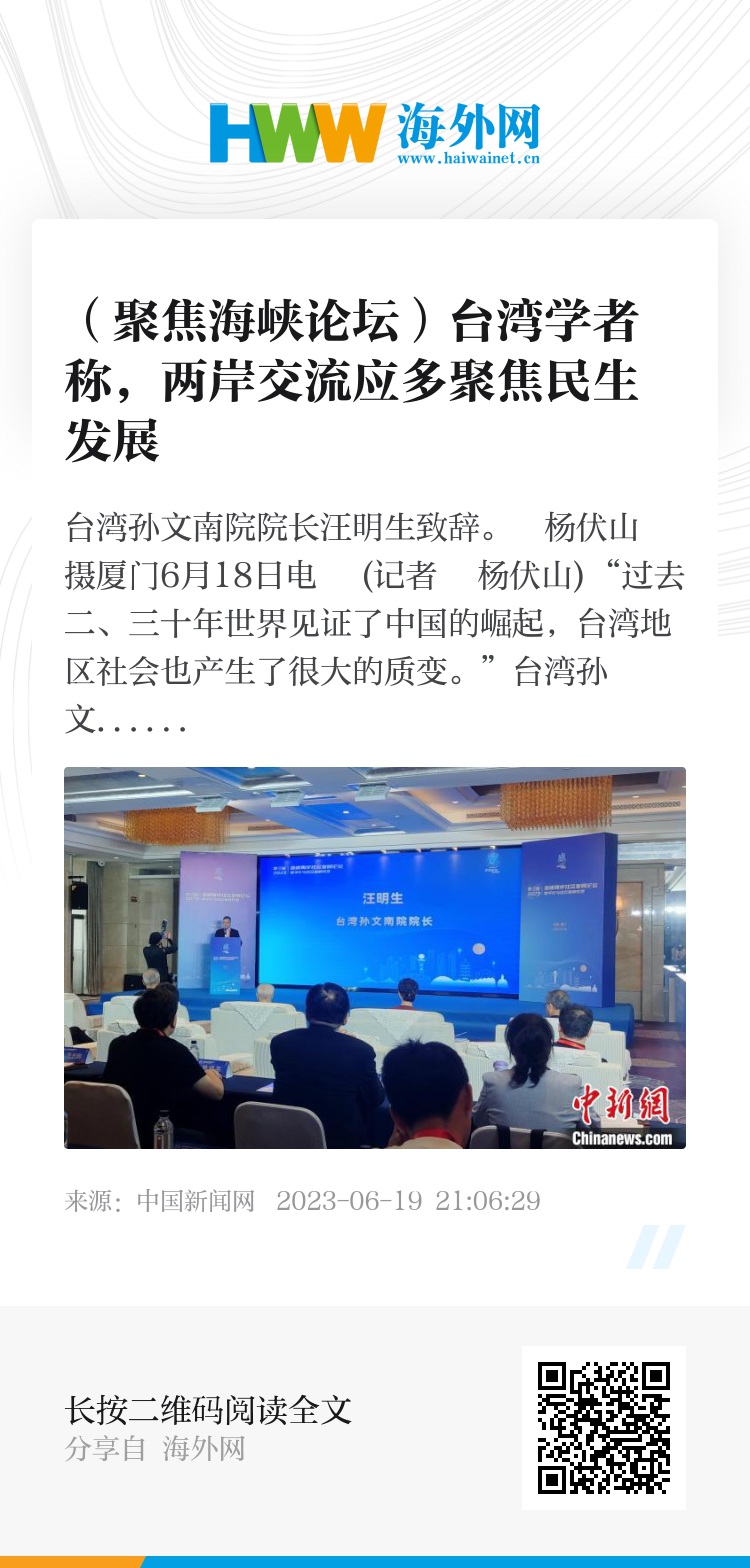 中新网厦门6月18日电 (记者 杨伏山)“过去二、三十年世界见证了中国的崛起,台湾地区社会也产生了很大的质变。”台湾孙文南院院长汪明生18日在厦门举办的一个论坛上表示,应通过此次参会台湾方面代表的报告,了解和重视台湾社会各个阶层、百工百业的更多不同需求。