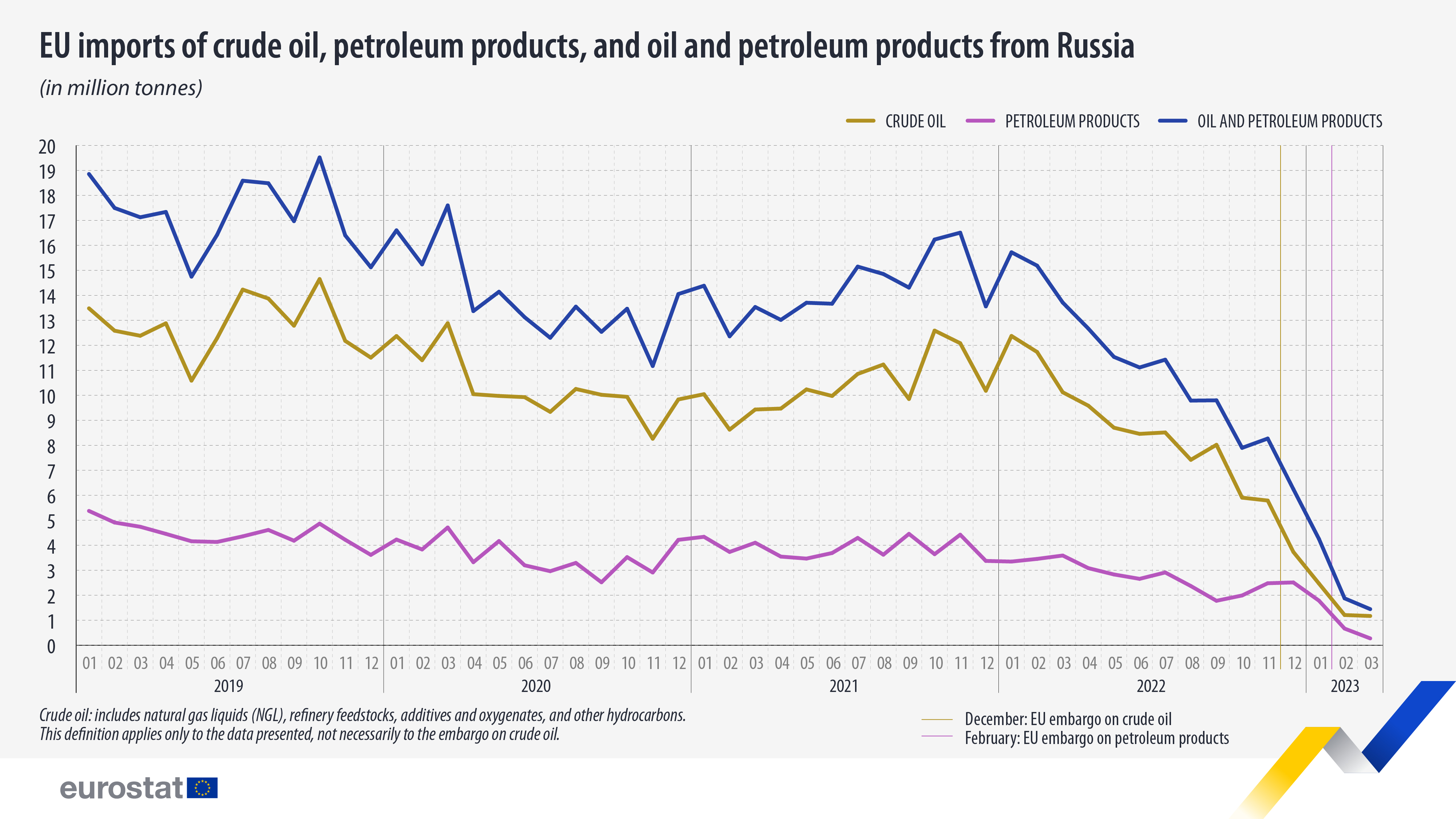 欧盟统计局当地时间6月19日发布的数据显示,今年3月,欧盟从俄罗斯进口的原油和石油产品总量下降至140万吨,而2019年至2022年的月均进口量为1520万吨,相比之下,今年3月的进口量减少了90%。