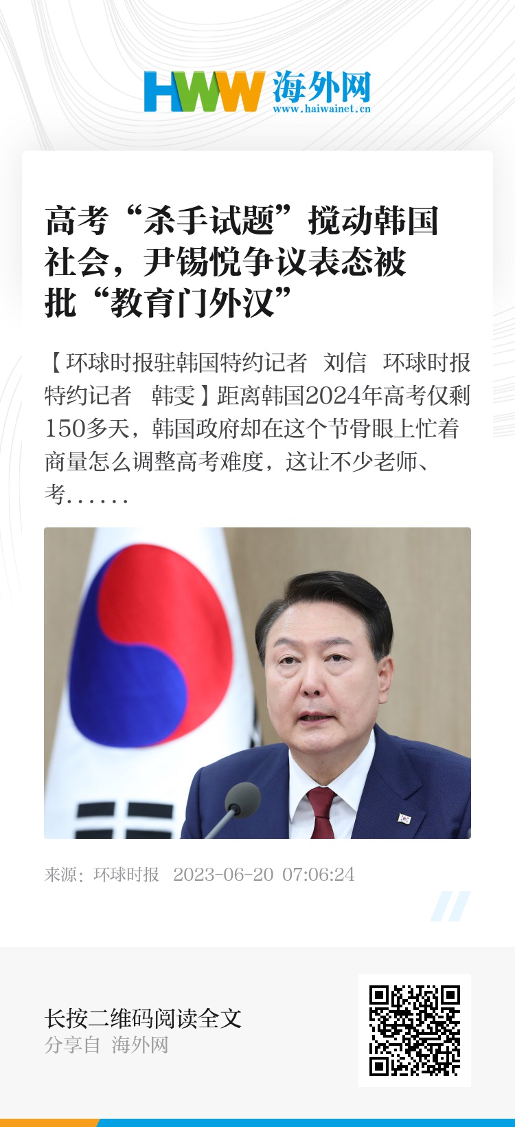 就当韩各界争议纷纷时,当地6月举行的一场模拟考让更多人摸不清楚头脑。这次模拟考题中依旧存在一些“杀手试题”,并没有像多数人预期中的那么容易。为此,韩国政府16日撤换了教育部主管高考的局长。教育部解释称,主管局长没有切实履行“不应出现教科书范围外的考题”的方针。教育部长官李周浩也受到尹锡悦警告。此外,韩总统府官员宣布,9月的模拟考中不会再出现“杀手试题”。但是,不少批评人士认为,尹锡悦是想在涉高考言论引发争议后推卸责任。总统府还发表声明称,总统本意也不是要调整高考难度。
