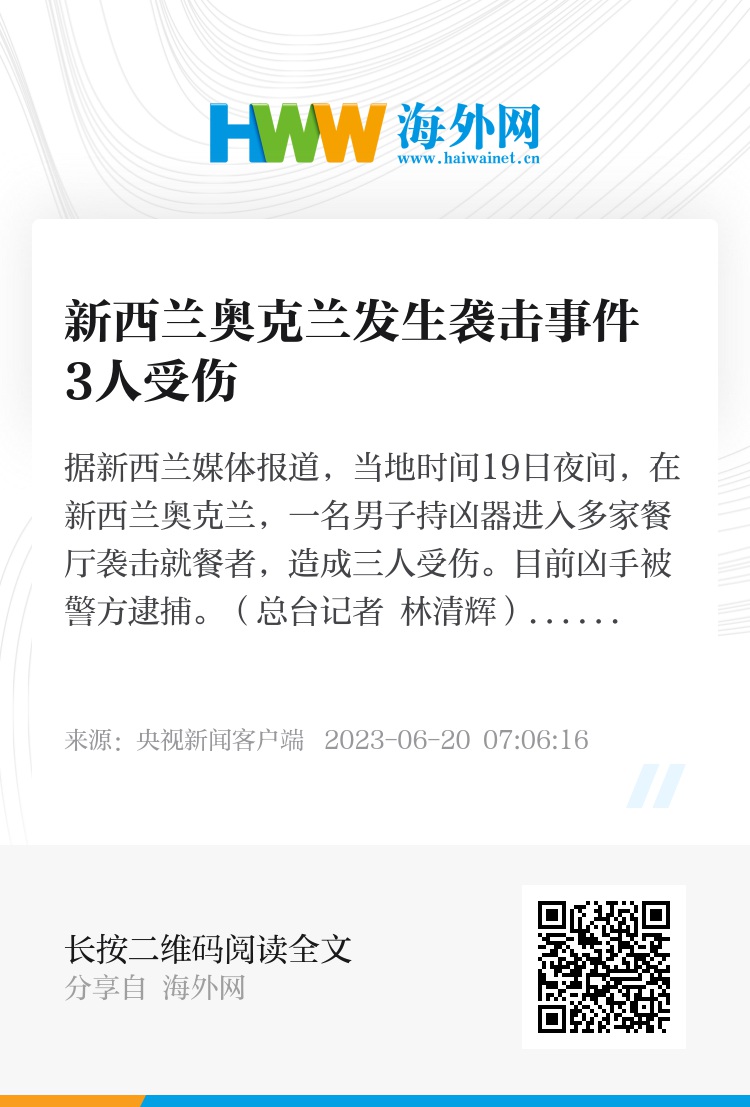 据新西兰媒体报道,当地时间19日夜间,在新西兰奥克兰,一名男子持凶器进入多家餐厅袭击就餐者,造成三人受伤。目前凶手被警方逮捕。(总台记者 林清辉)