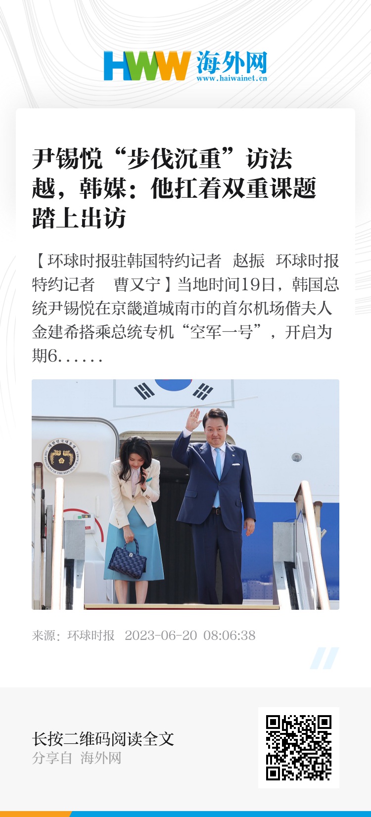 【环球时报驻韩国特约记者 赵振 环球时报特约记者 曹又宁】当地时间19日,韩国总统尹锡悦在京畿道城南市的首尔机场偕夫人金建希搭乘总统专机“空军一号”,开启为期6天的法国、越南访问之旅。